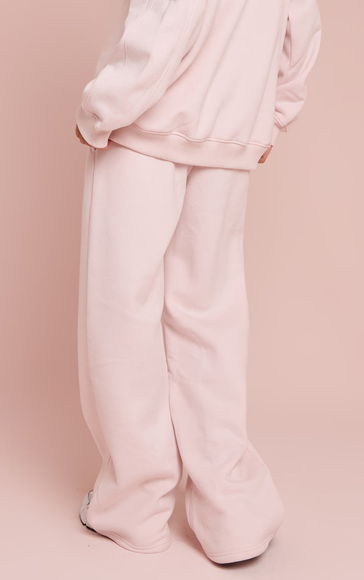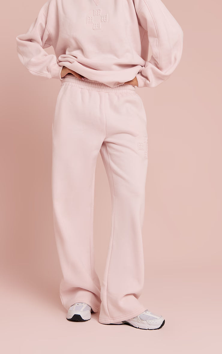 Effortless comfort meets considered design for your everyday edit. The baby pink plt embossed wide leg sweatpants deliver an unconstrained yet polished silhouette, featuring a relaxed wide leg cut and subtle PLT embossing that adds an artful touch to athleisure. Team with the coordinating Sweatshirt for a cohesive set, or style with a fitted ribbed top for a more streamlined aesthetic. Ground your knowing stride with chic woven ballet flats and complete the thoughtful look with a crisp white shoulder bag, ensuring your day aesthetic is always self-assured.