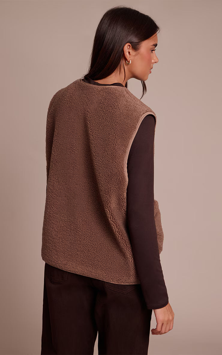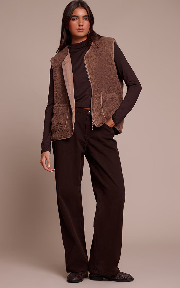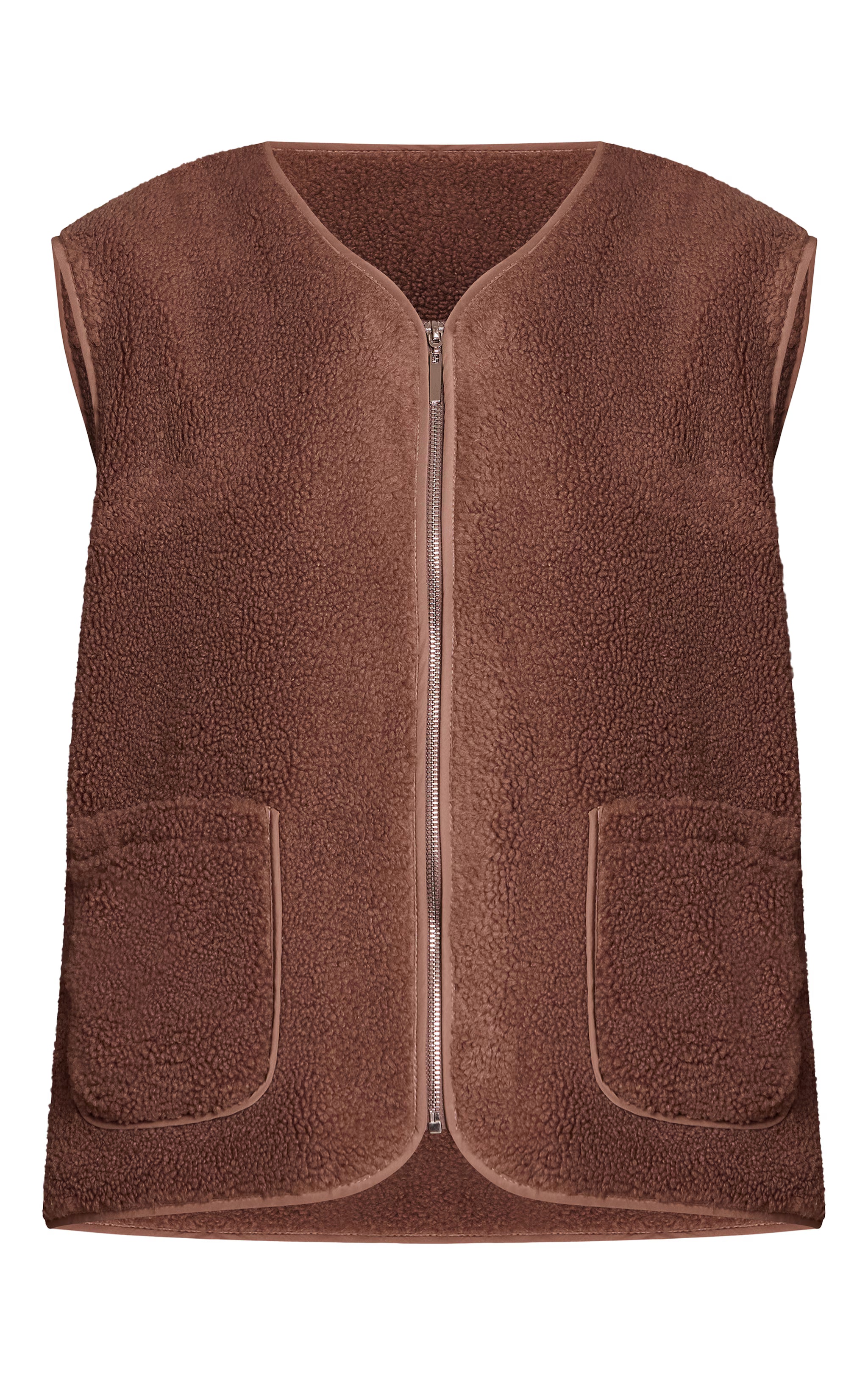 Own your everyday style with this essential layer. The beige borg vest features a V-neckline and full zip fastening, designed with a sleeveless cut and two rounded front patch pockets for a touch of practical utility. Layer yours effortlessly over a tonal long-sleeved sweater and wide-leg pants, grounding the entire look with a pair of commanding boots. A simple gold ring adds that knowing finishing detail, ensuring your daytime ensemble is effortlessly composed.