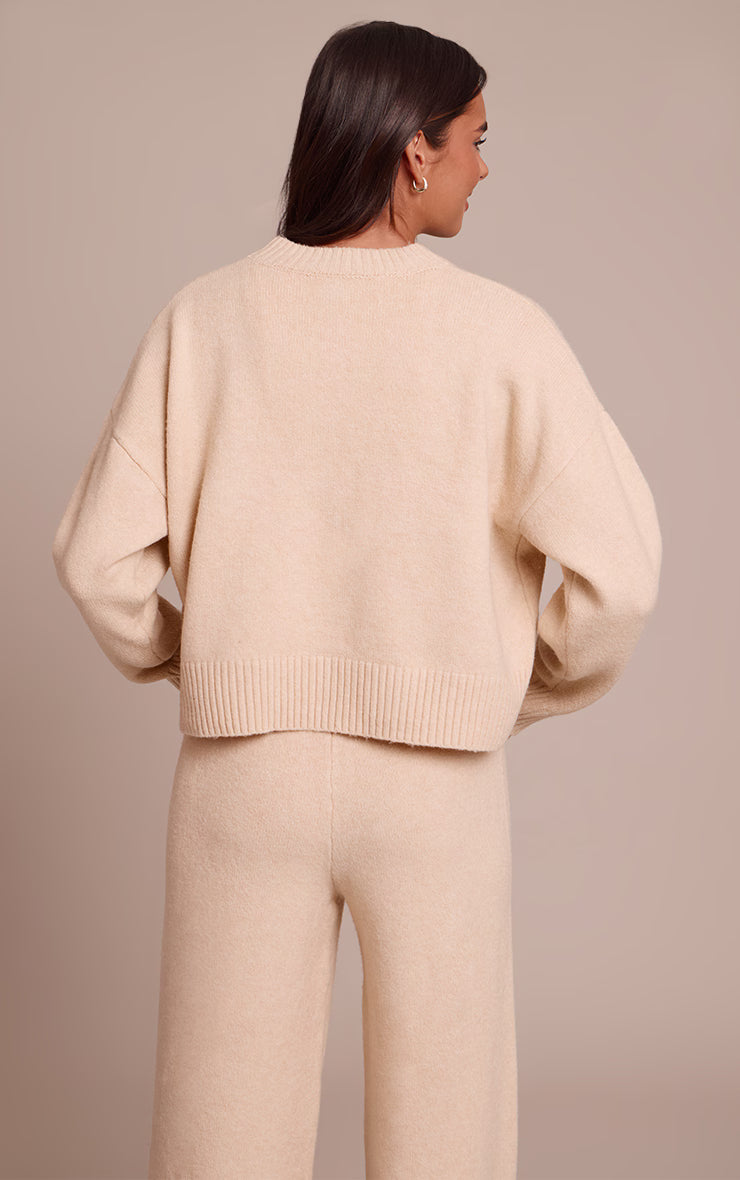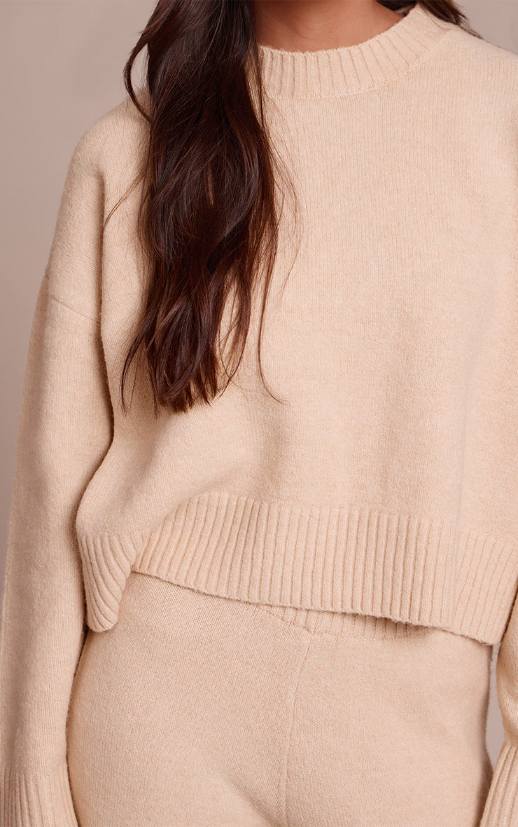 Own your day in pieces that balance comfort and understated style; the beige marl knitted cropped crew neck sweater is your elevated essential. Its confident cropped silhouette, framed by a classic crew neckline and subtle ribbed detailing at the cuffs and hem, offers a relaxed yet refined fit. Pair this versatile piece with tailored high-waisted pants for a chic, monochrome aesthetic, or juxtapose with dark wash denim for a relaxed day look. Complete your ensemble with sleek ballet flats and delicate pearl earrings, ensuring an effortlessly polished finish that speaks to your confident sensibility.