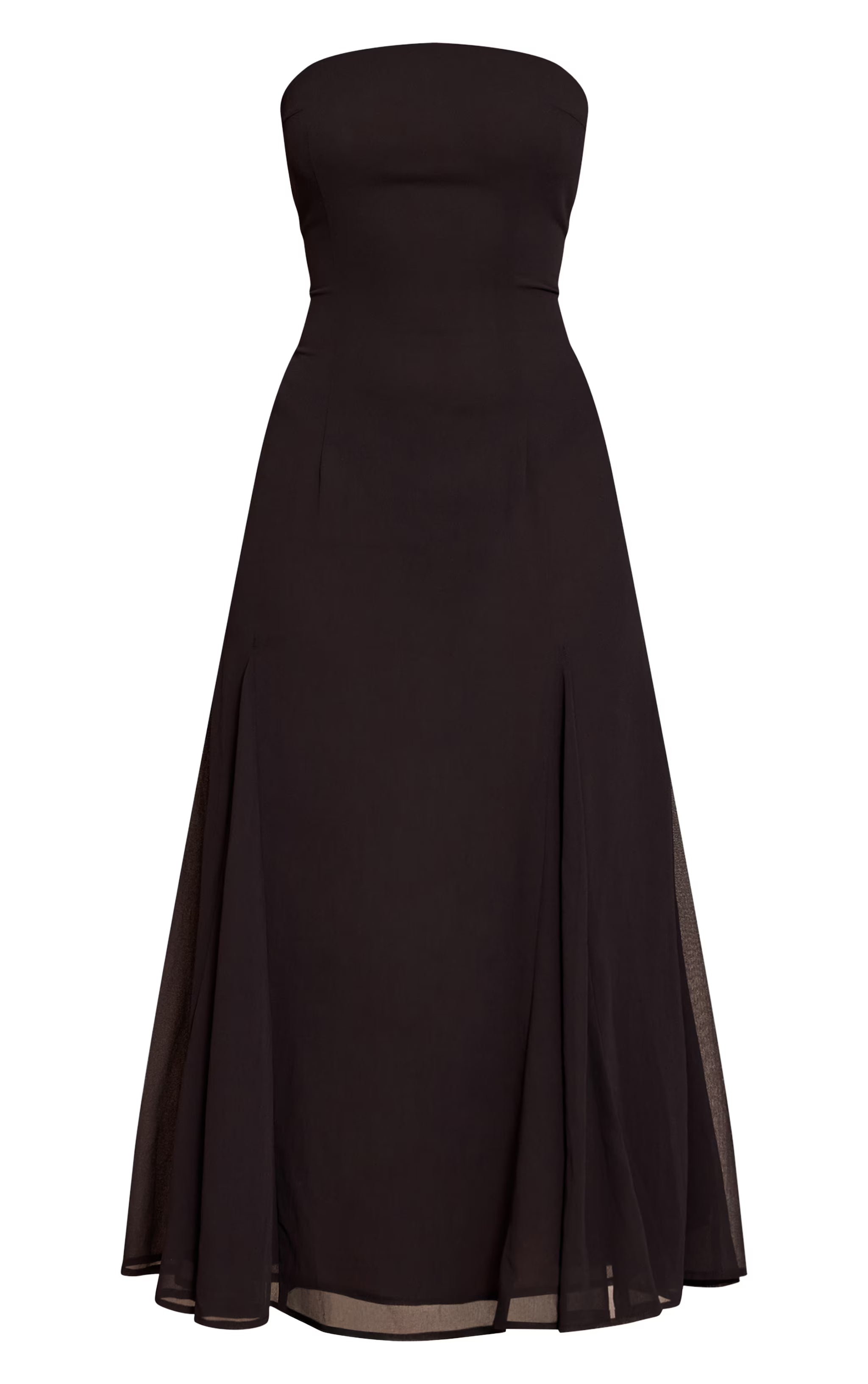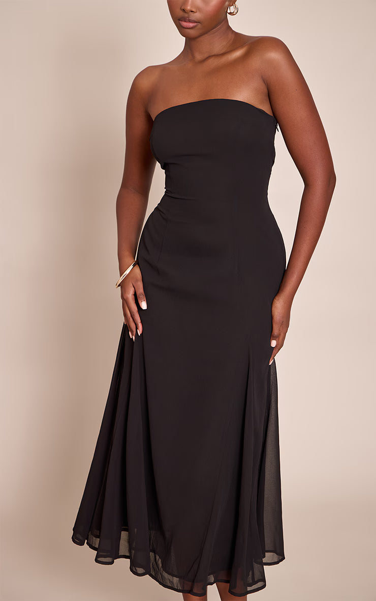 Achieve an immediate impact with a piece designed for effortless evening presence. The black bandeau godet midaxi dress defines a refined aesthetic, featuring a sleek bandeau neckline and a fitted bodice that creates a statuesque silhouette. Its midaxi length is elevated by subtle godet inserts that introduce a beautiful, fluid movement to the skirt, ensuring an artful entrance. Pair it with striking gold heels for an elevated stance, and complement the décolletage with elegant drop earrings. This dress is your definitive choice for an evening aesthetic that speaks volumes without a whisper.