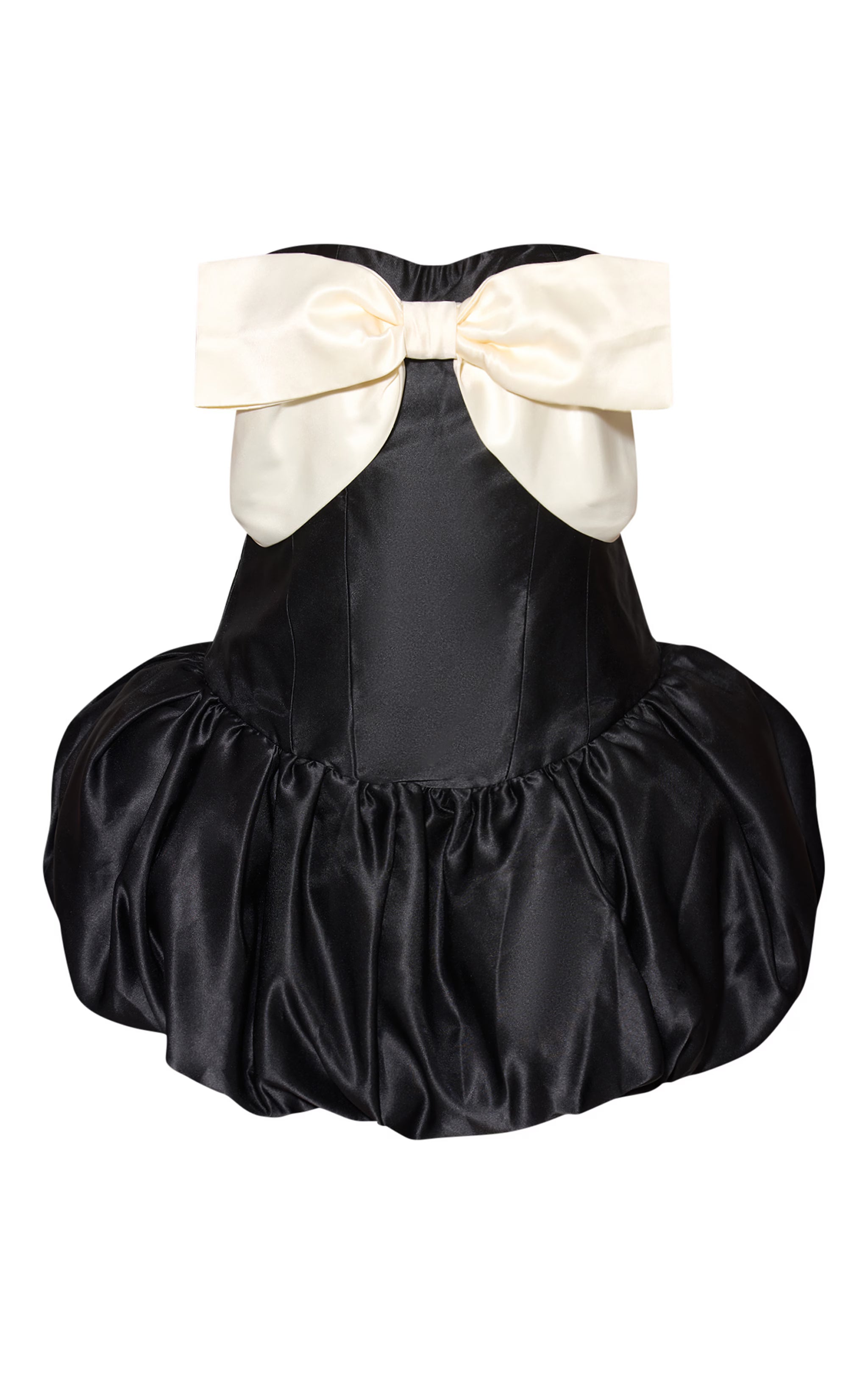 Let the details do the talking with a dress that’s anything but shy. The black bandeau satin bow detail puffball mini dress defines modern occasion wear, featuring a sleek bandeau neckline and a form-flattering bodice. Its dramatic cream satin bow detail commands every gaze, elegantly contrasted by a voluminous puffball mini skirt. To complete this striking look, reach for sharp gold strappy heels and a minimalist clutch bag, ensuring your presence is felt the moment you step out.