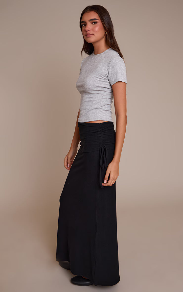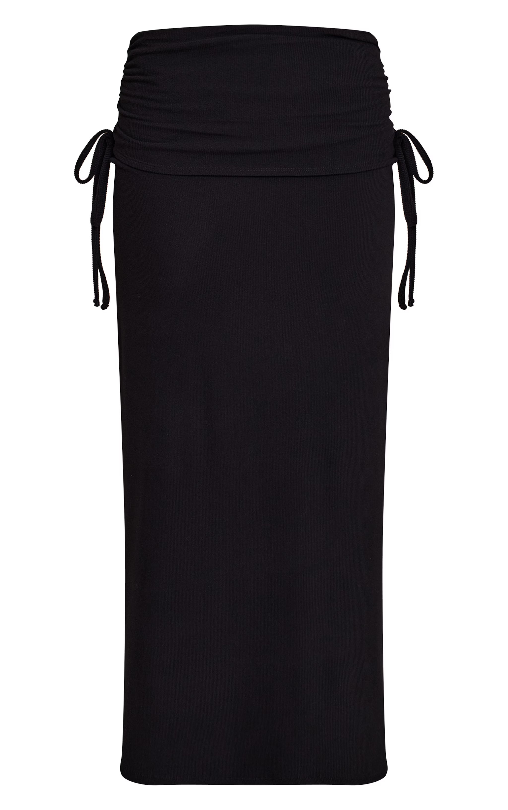 Master the art of versatile dressing with a silhouette built for modern life. The black brushed rib ruched detail maxi skirt features adjustable side ties, allowing you to customise the ruched effect for a unique fit that contours the body. Its elongated maxi cut creates a refined line, perfect for a day occasion. Pair it with a simple fitted vest or a crisp button-down blouse, finishing the ensemble with elegant black ballet flats and understated accessories for a look that's both polished and unpretentious.