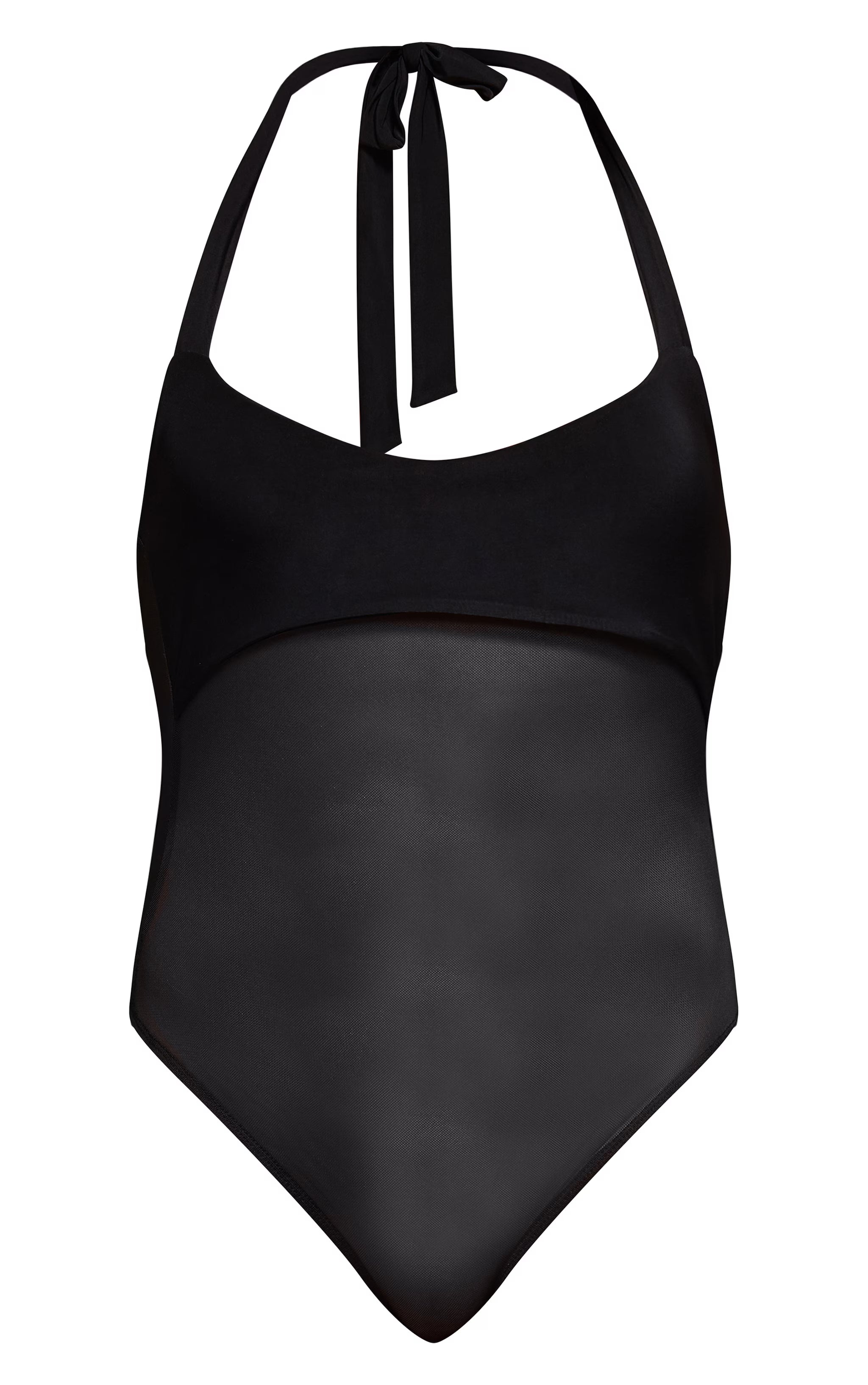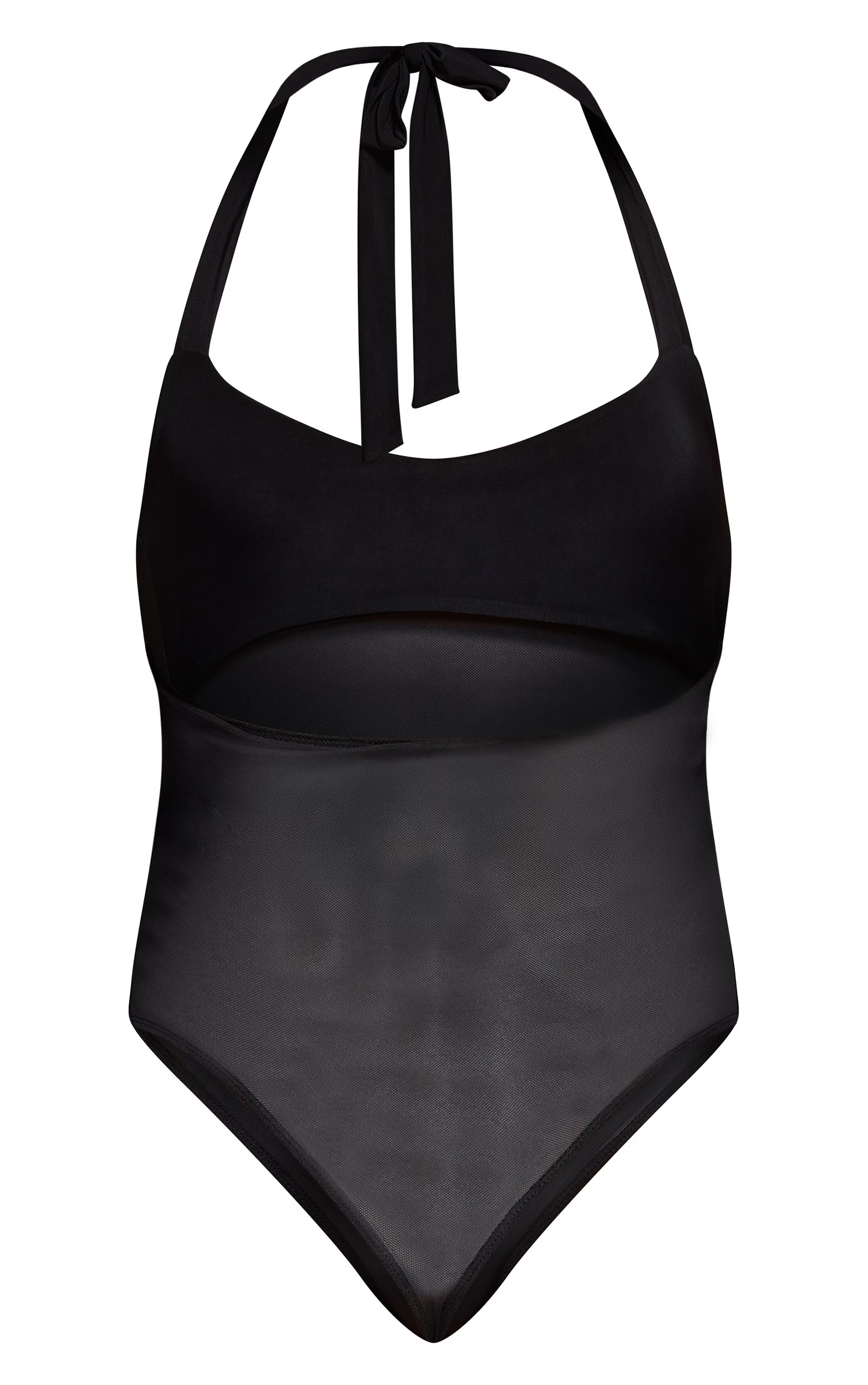 Command attention the moment you step out with the black bust detail mesh halterneck bodysuit, a piece designed to elevate your evening repertoire. Its sleek halterneck design gracefully frames the décolletage, leading to a chic bust detail that offers a refined shape. An artfully placed sheer mesh panel through the torso introduces a dynamic element, adding depth and allure to the silhouette. Style this essential with high-waisted tailored pants for a streamlined aesthetic, completing the look with refined black kitten heels and a minimalist black shoulder bag. This isn't just a bodysuit; it's your go-to for making an undeniable statement.