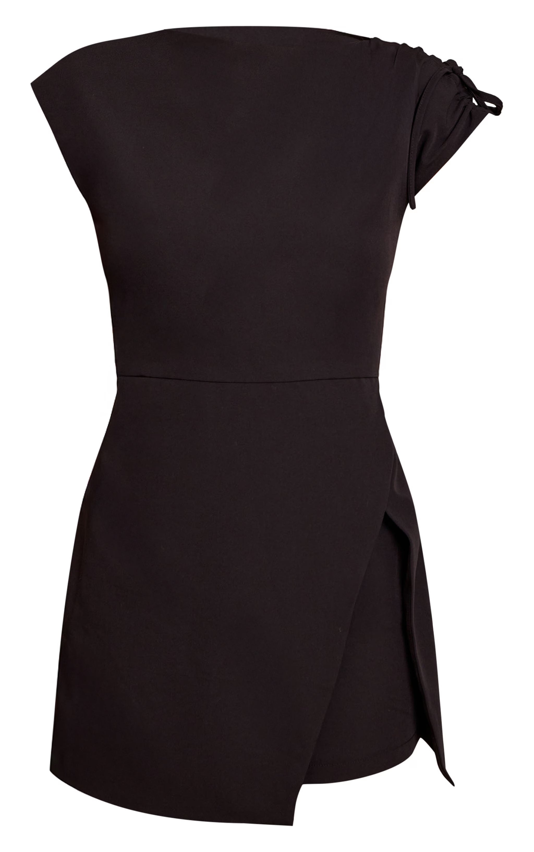 Effortless style starts with the right foundation. This black button detail cap sleeve shift dress masters understated sophistication with its clean boat neckline and distinctive cap sleeves, artfully accented with delicate tie details. The streamlined shift silhouette falls elegantly, leading to a contemporary wrap-style hem that creates a subtle, confident split. For an elevated day agenda, pair this versatile piece with sleek gold heels and refined drop earrings, ensuring a look that speaks volumes about your assured taste.