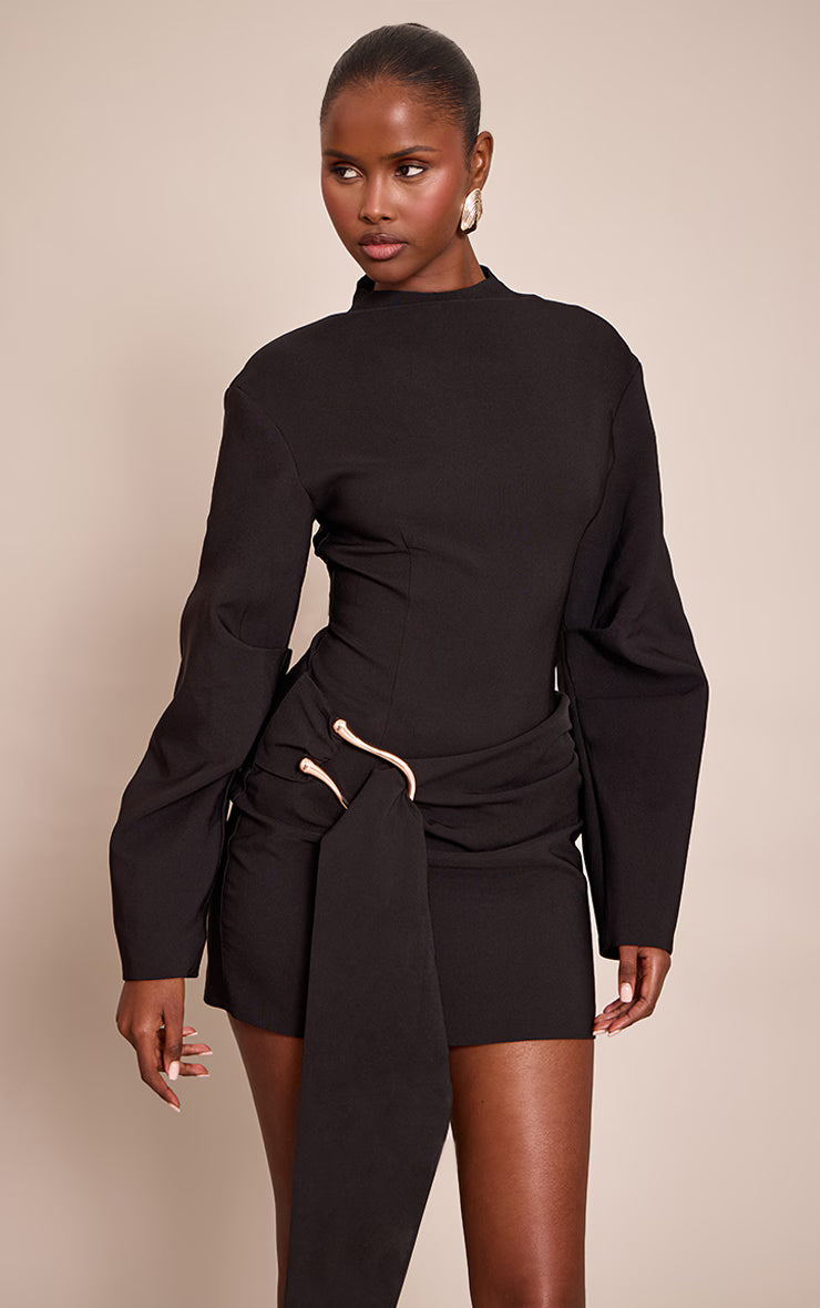 An artful outline for after-dark occasions. The black cacoon sleeve trim detail mini dress commands attention with its high neckline and dramatically sculpted long sleeves, creating a powerful shoulder line. It flows into a sleek, mini-length bodycon fit, further elevated by the distinctive gold-tone hardware that artfully cinches the waist and creates a dynamic side drape. Curate an unforgettable evening ensemble by pairing this confident piece with coordinating gold heels and subtle gold stud earrings. It's how you define modern elegance with effortless precision.