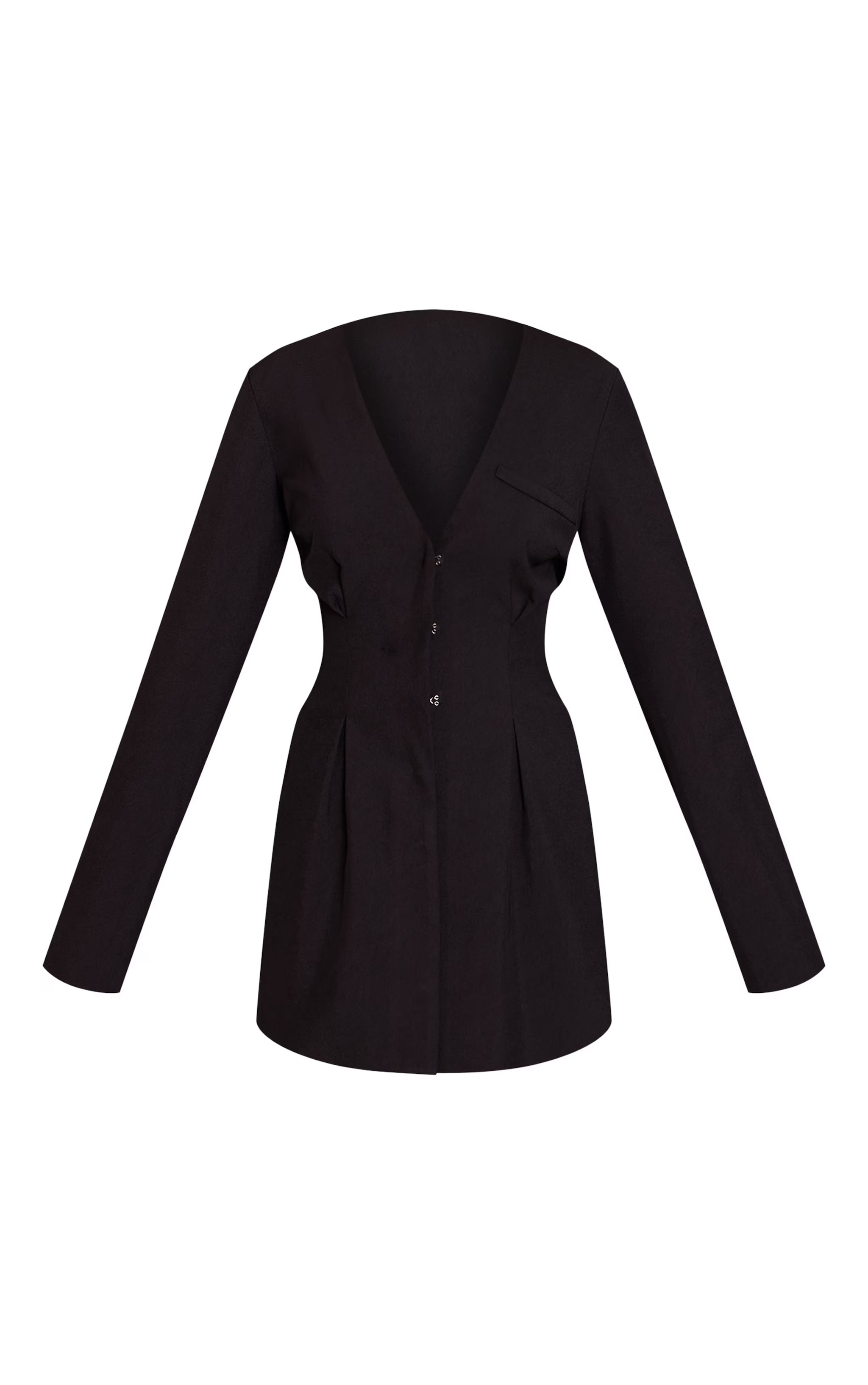 Sophistication takes center stage with this power piece. The black cinched waist pleated blazer dress commands attention, featuring a deep V-neckline and tailored long sleeves that exude confidence. Its artfully cinched waist flawlessly flows into a pleated mini skirt, creating a polished silhouette perfect for after-dark occasions. Complete this look with sharp gold heels and a delicate gold ring for an effortlessly put-together finish that owns the room.