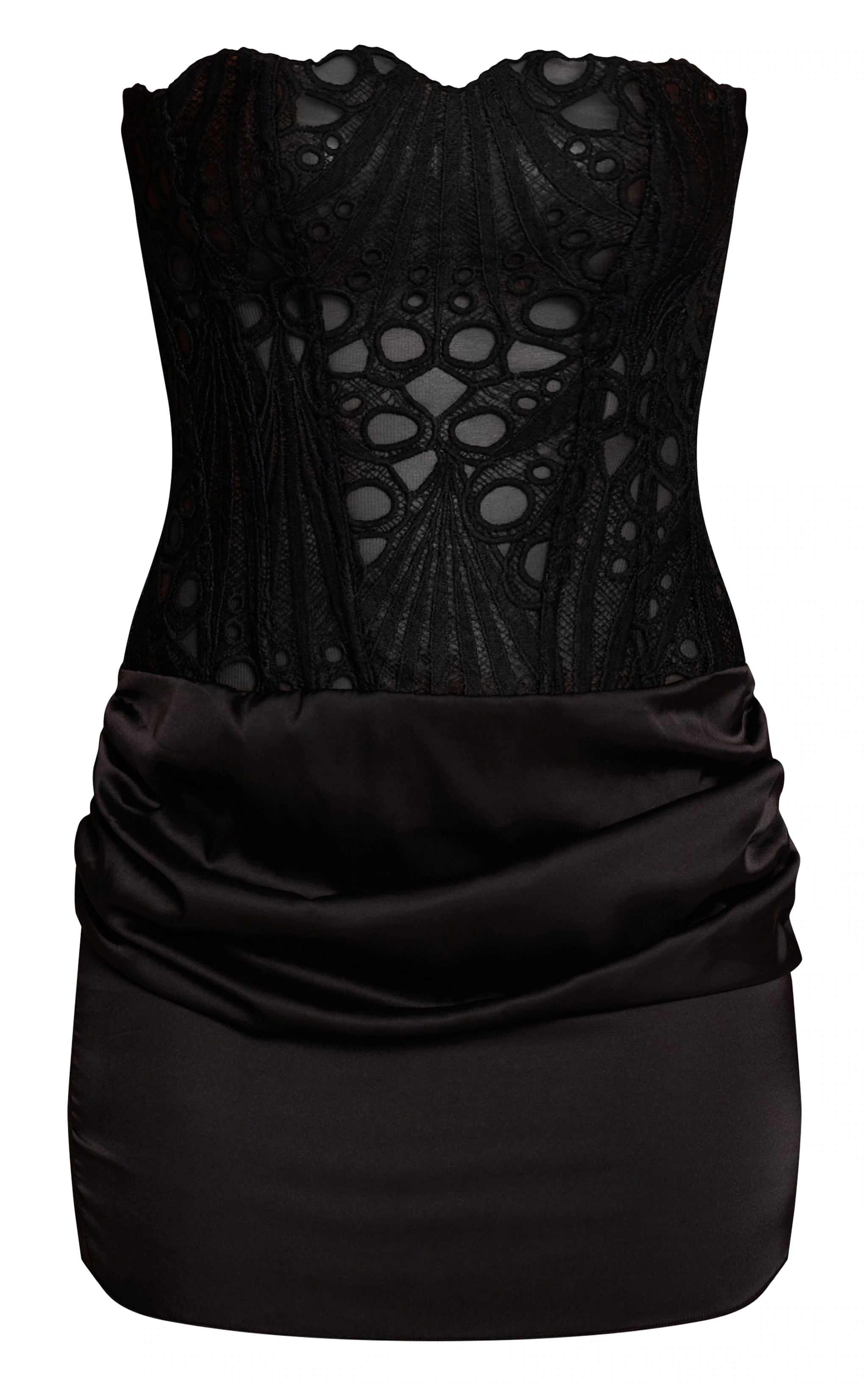 A knowing silhouette for your next evening out. The black corset detail satin ruched mini dress delivers instant impact with its intricate strapless bodice, featuring a delicate lace overlay and a flattering sweetheart neckline. Below, the satin mini skirt is artfully ruched, creating a confident silhouette. Complete this look with sleek closed toe heels and a minimalist black bag for an effortlessly elevated presence. This piece ensures your evening style is always on point.