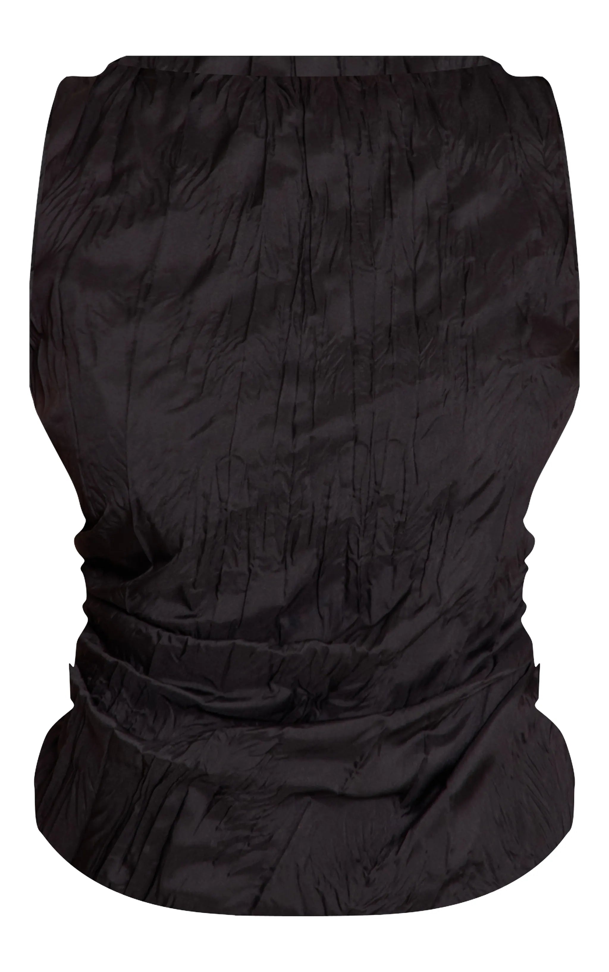 Make an impact without overstating it, curating a confident evening look with texture and form. This black crinkled woven ruched detail top is designed with a high, gathered neckline and a beautifully cinched bodice, creating a modern, flattering silhouette that drapes elegantly. Style this sophisticated piece with tailored wide-leg pants for an elevated, contemporary ensemble, anchoring the look with sleek nude heels. Finish with a flash of gold jewelry to ensure your presence is effortlessly noted.