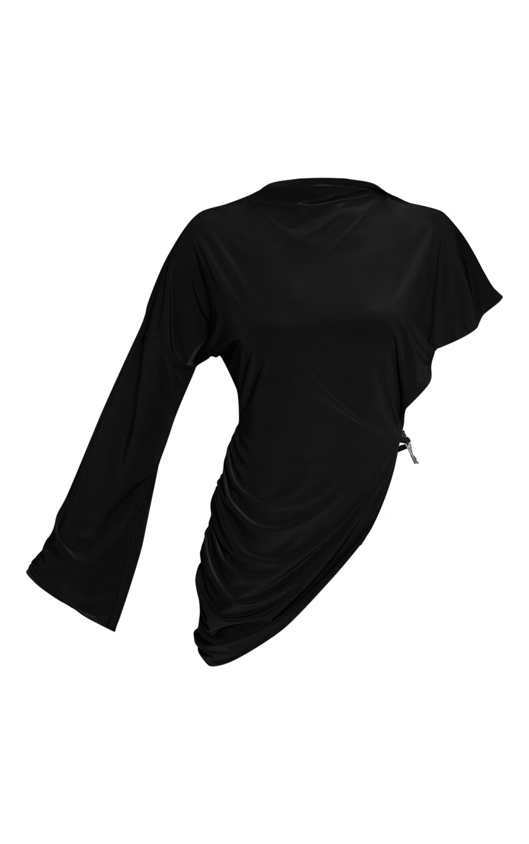 Command attention with a silhouette that masters sophisticated asymmetry. The black double layer slinky oversized drape detail long sleeve top redefines after-dark dressing, presenting a high draped neckline that flows into a striking contrast of a single long sleeve and an artfully cut-out side. This considered design sculpts a confident profile, moving with intention from its oversized drape to its distinctive hem. Balance its bold lines with sleek tailored pants or a sharp mini skirt for an ensemble that speaks volumes. Complete your look with elegant nude heels and minimalist stud earrings, asserting an aesthetic that's both direct and effortlessly refined for any evening occasion.