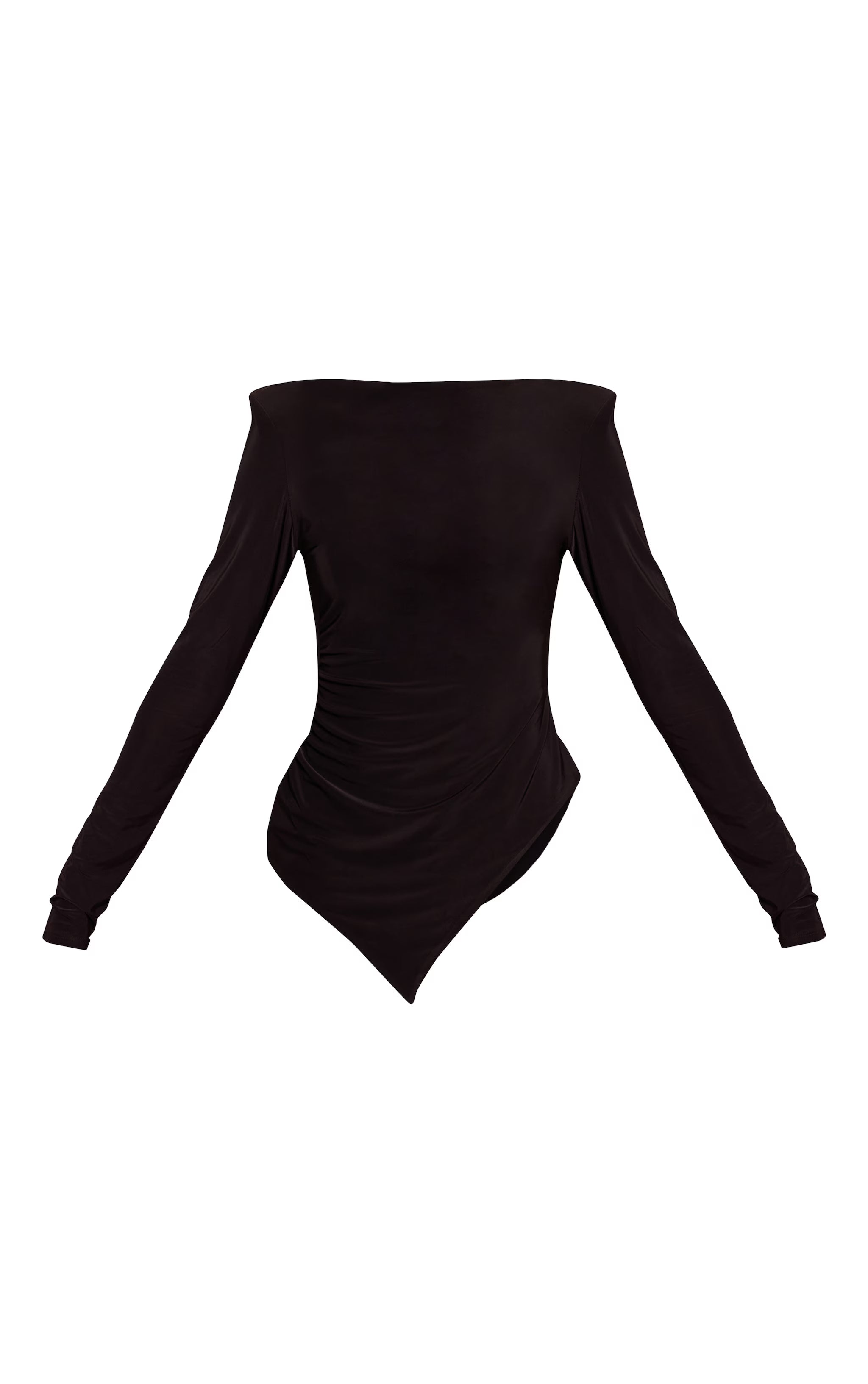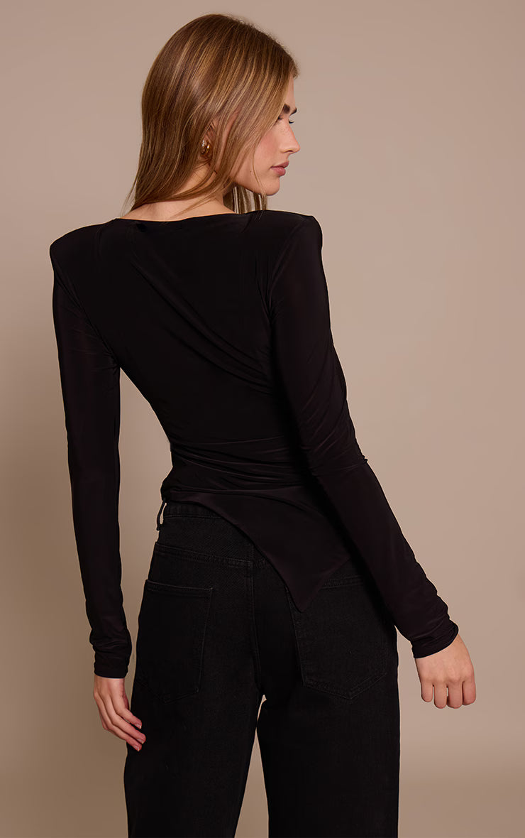 Own your look with a piece that balances modern structure and effortless style; the black double layer slinky shoulder pad asymmetric top is an essential for your day edit. This impactful black top features a sophisticated wide neckline and confident shoulder pads that create a defined upper silhouette, complemented by long sleeves and artful ruching that leads to an edgy asymmetric hemline. Style this versatile piece with tailored black pants and sleek ankle boots for a refined everyday ensemble, completing the look with delicate gold bracelets for a touch of polished elegance.