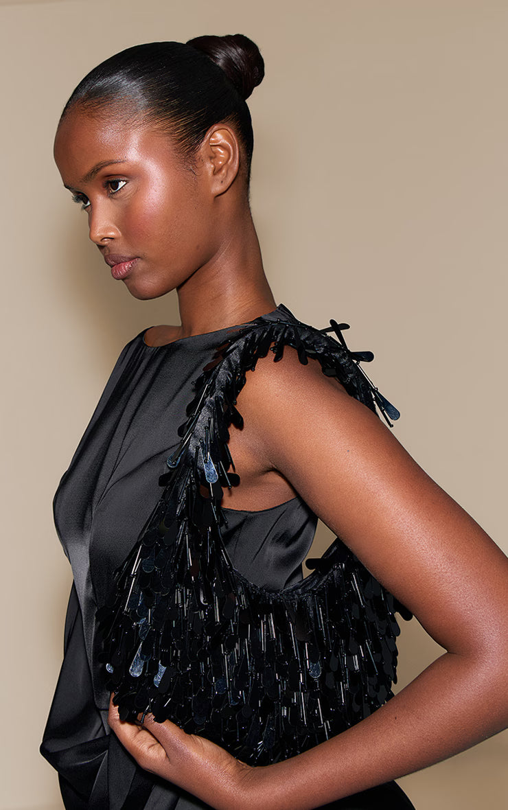 Command attention effortlessly with the black embellished sequin shoulder bag, a design that moves with you. This distinct accessory boasts dynamic, cascading black sequins throughout, crafting an intricate texture that catches the light with every gesture. Pair it with a sharp tailored two piece set and sleek black ballet flats for a refined evening outfit, complete with subtle gold earrings to truly finish the look.