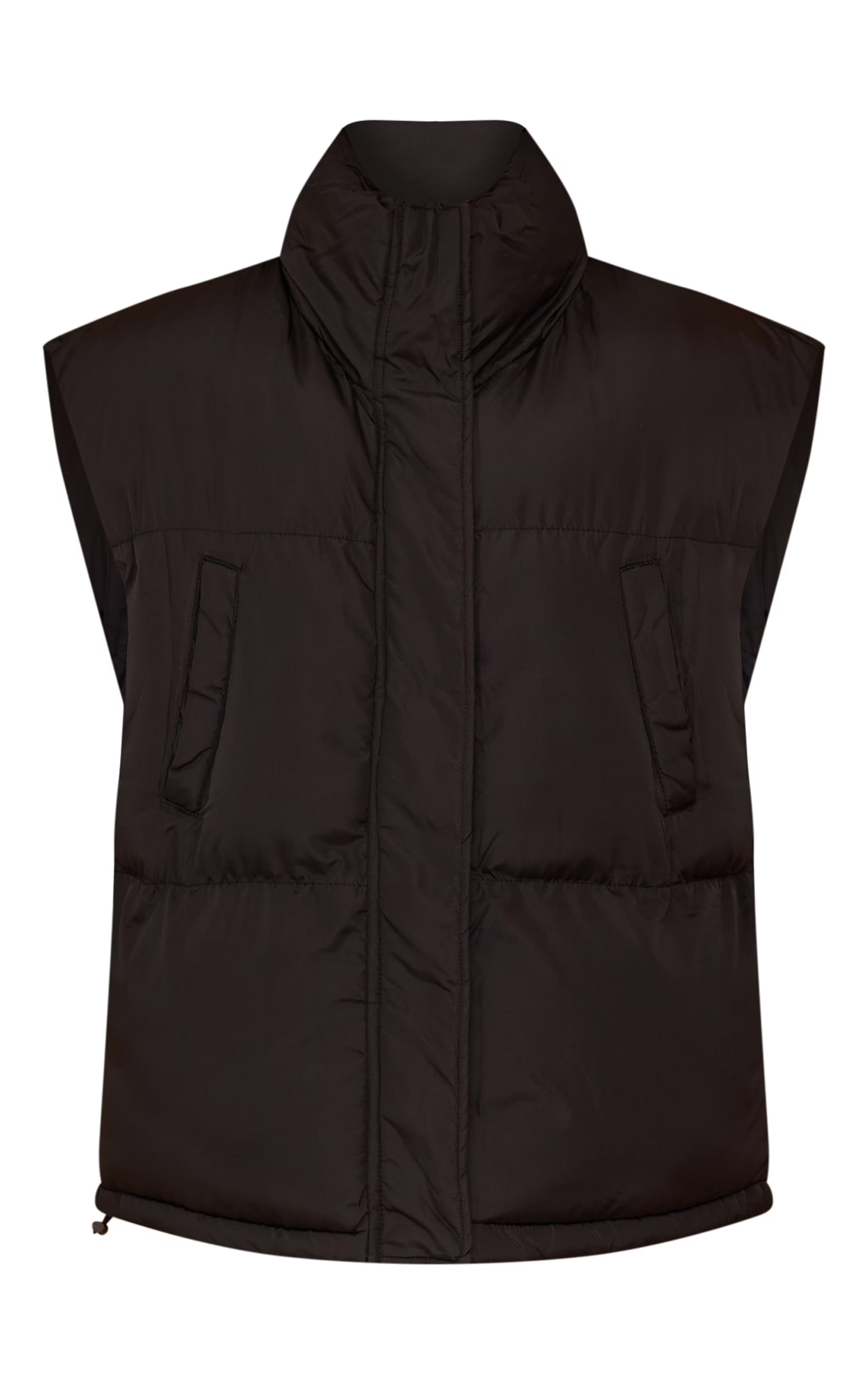Your go-to for statement layering just dropped with this black extended shoulder sleeveless puffer vest. Its artfully padded design features a contemporary extended shoulder and a high stand collar, creating a confident silhouette for day. The concealed front fastening ensures a sleek, uninterrupted line, complemented by practical side pockets and an adjustable hem. Throw it over a ribbed long-sleeve top and tailored black pants for an effortlessly chic day look, grounded with chunky boots and a hint of minimal gold jewelry. This piece ensures your outfit always makes an impact.