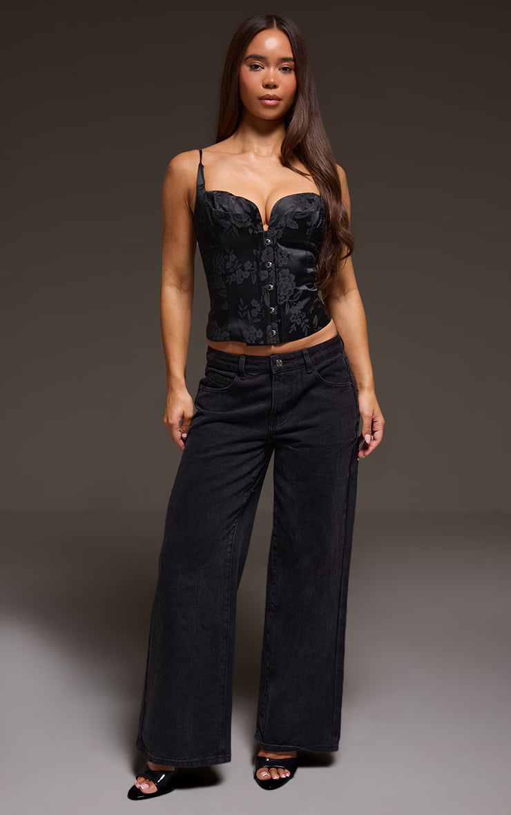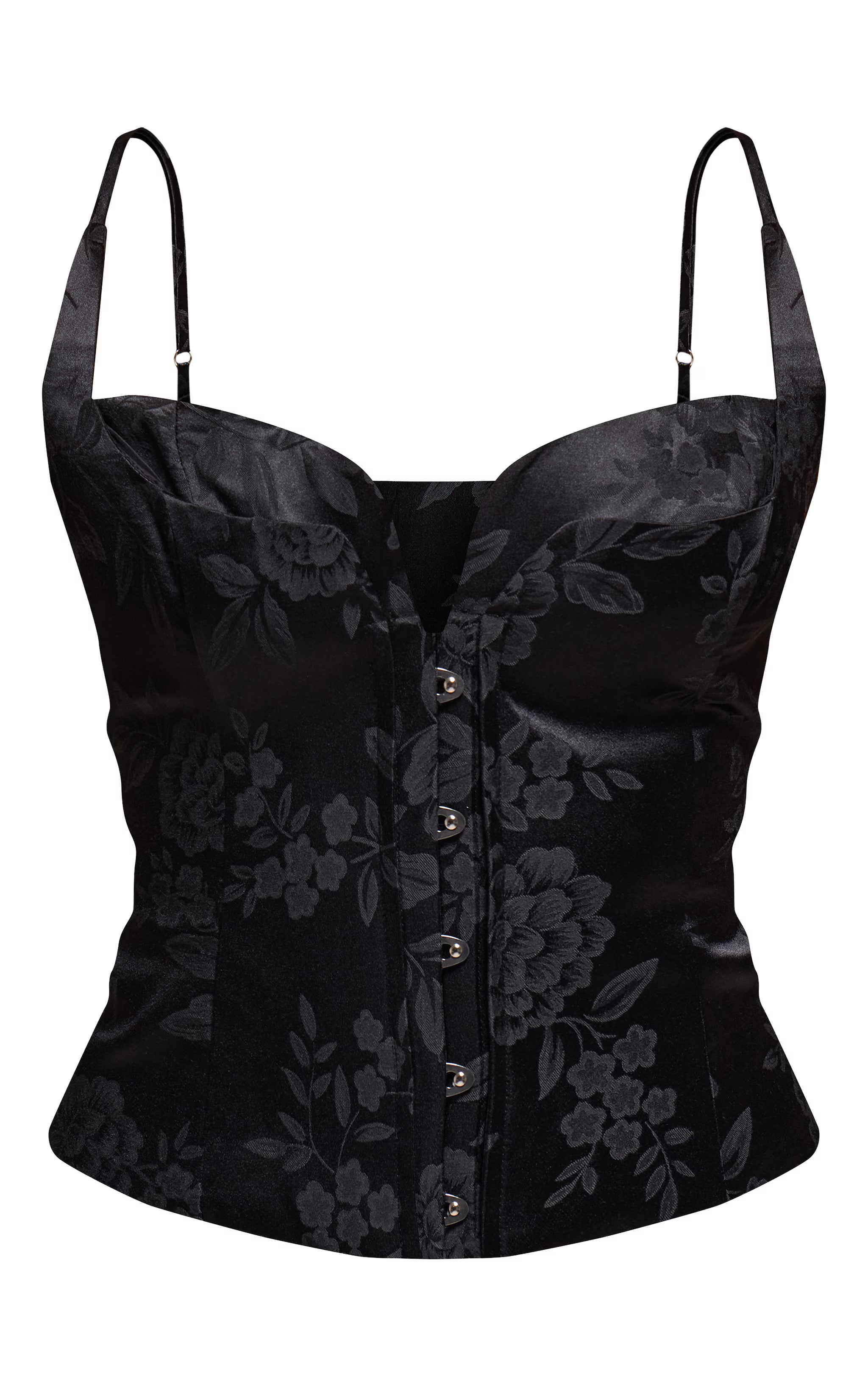 Make an entrance. The black floral embossed hook and eye corset is engineered for a powerful evening aesthetic, featuring a striking sweetheart neckline and a deep V-cut that beautifully frames the décolletage. Its precise hook and eye fastenings trace the center, creating a sharp, structured silhouette adorned with a subtle floral embossment. Pair this assertive piece with high-waisted tailored pants and complete the ensemble with sleek clear heels. Finish your look with a structured black bag for an effortlessly refined appeal, poised for a confident evening.