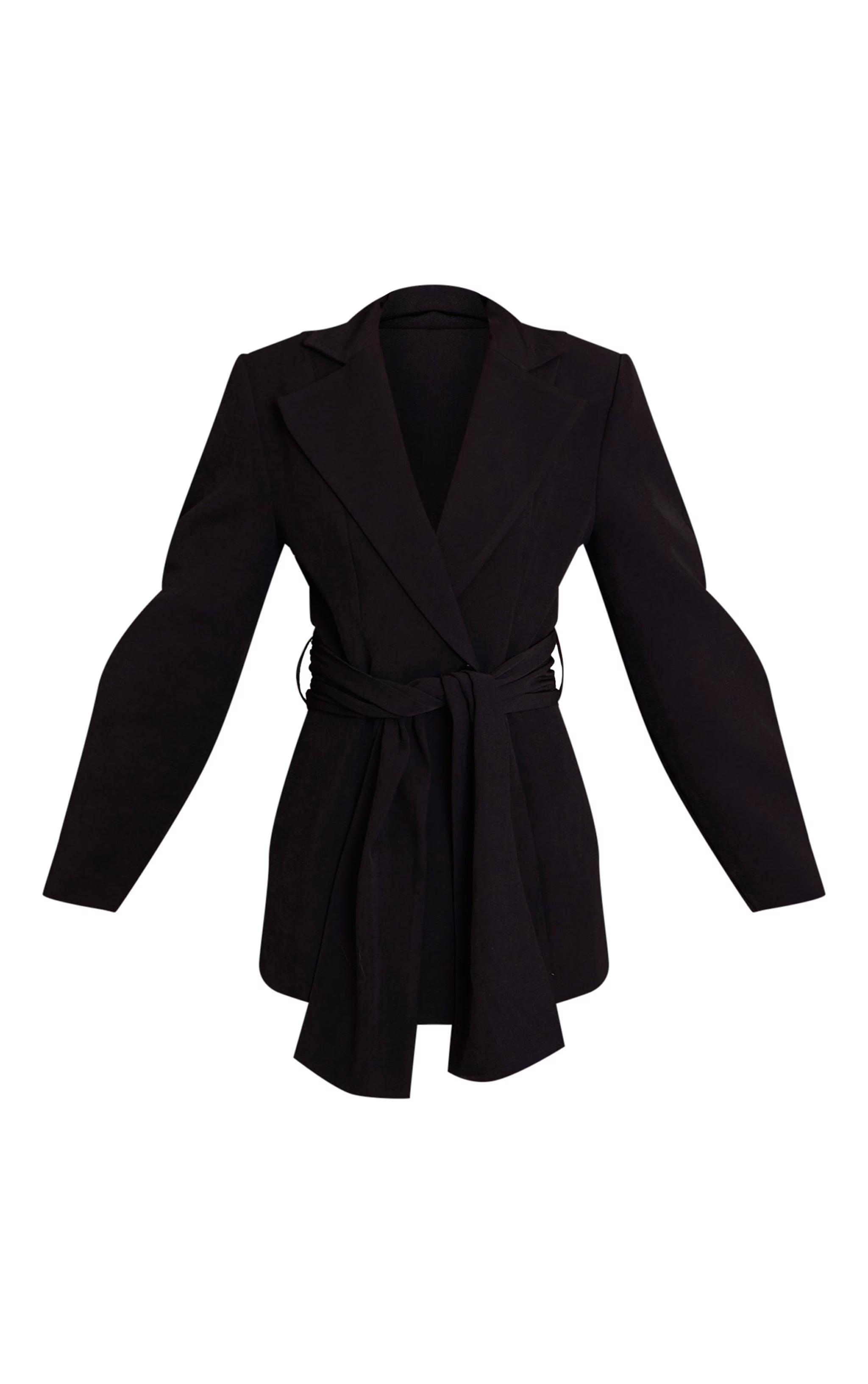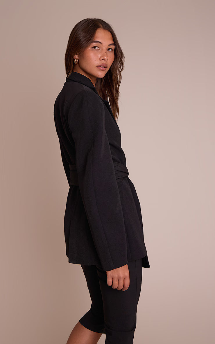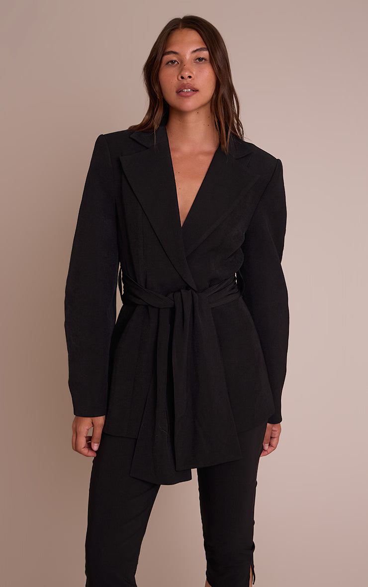 Refine your wardrobe with the black gathered wrap waist belted blazer. Designed from premium woven fabric in a deep black shade, this blazer features a wrap-front silhouette with gathered waist detailing and a matching belt for a chic, cinched-in shape. Perfect for both office wear and evening styling.