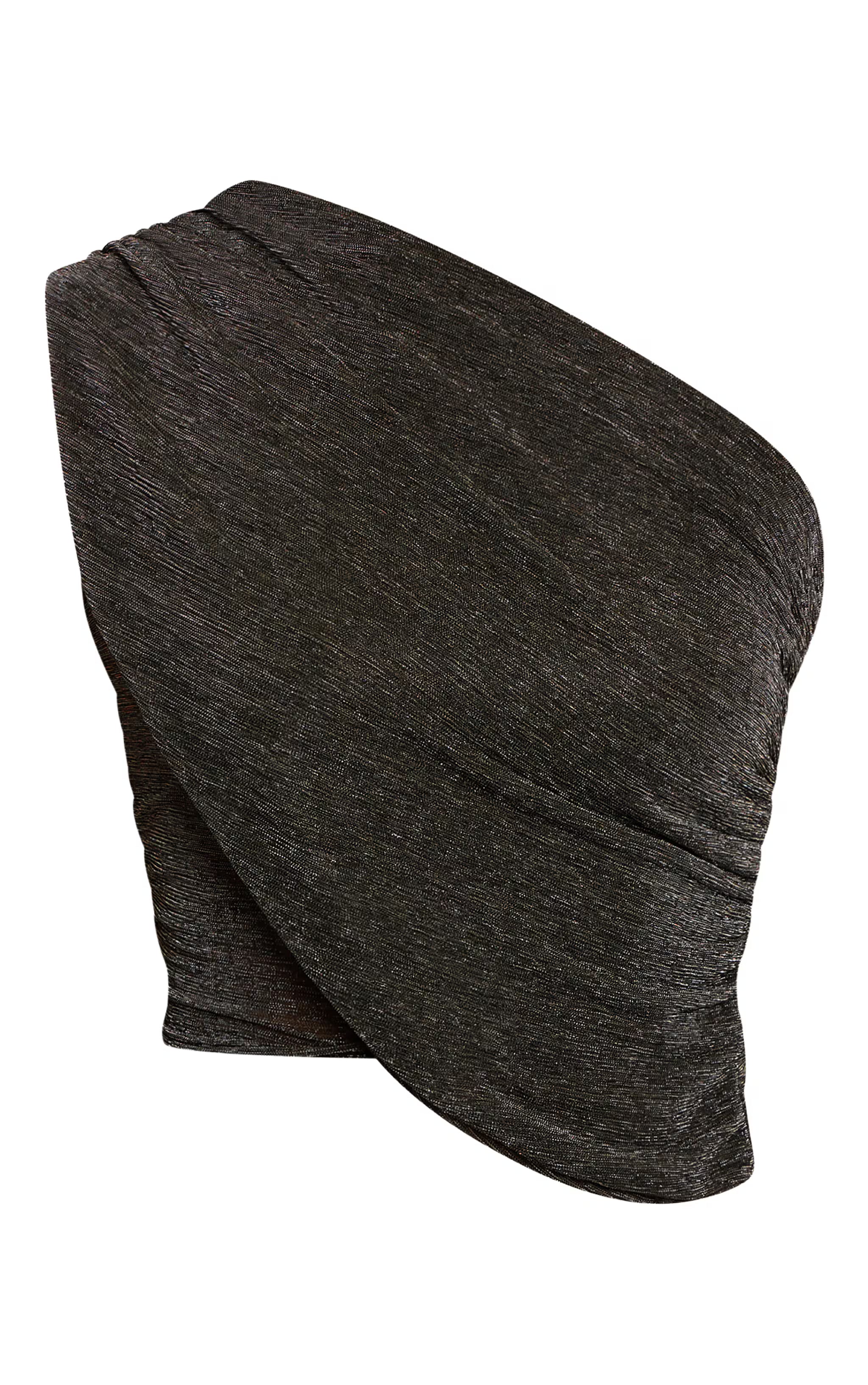 For those who dress to be noticed, this black glitter one shoulder ruched drape long top delivers on every front. Its distinctive one-shoulder design, combined with a shimmering black glitter finish and artfully ruched and draped detailing, ensures a confident silhouette. Crafted to perfection, this top perfectly complements its matching mini skirt, creating a cohesive, impactful look. Complete your evening aesthetic with sleek gold heels and a pair of statement gold earrings for an ensemble that radiates effortless power.