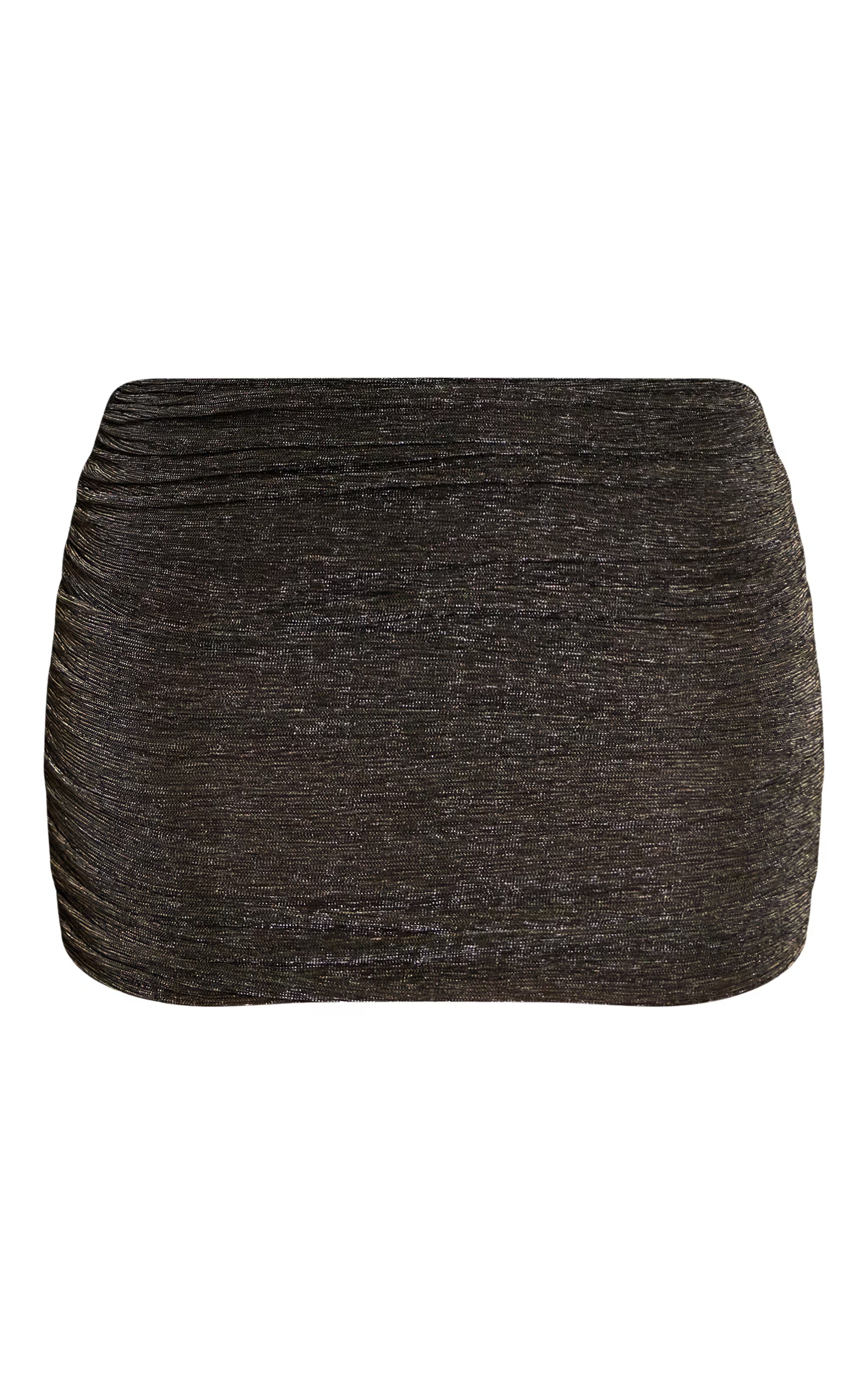 Make a direct statement for your next evening out with the black glitter ruched mini skirt mid rise. This confident piece defines after-dark impact, its artful ruching creating a sculpted form, balanced by a knowing mini length and sparkling glitter finish that catches every light. Pair this standout piece with the co-ordinating one-shoulder top for an undeniable ensemble, or a sleek velvet cami to amplify your presence. Ground the look with powerful knee high boots and subtle gold stud earrings, ensuring an aesthetic that's both polished and utterly self-aware.