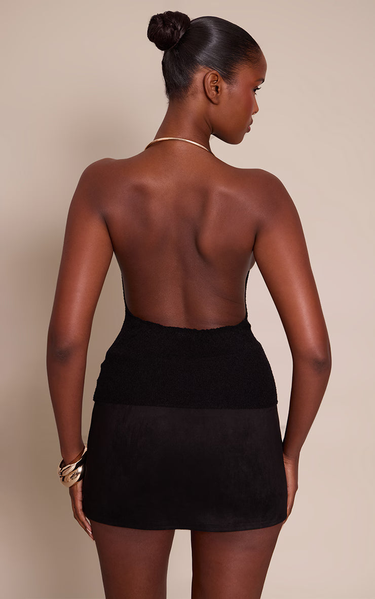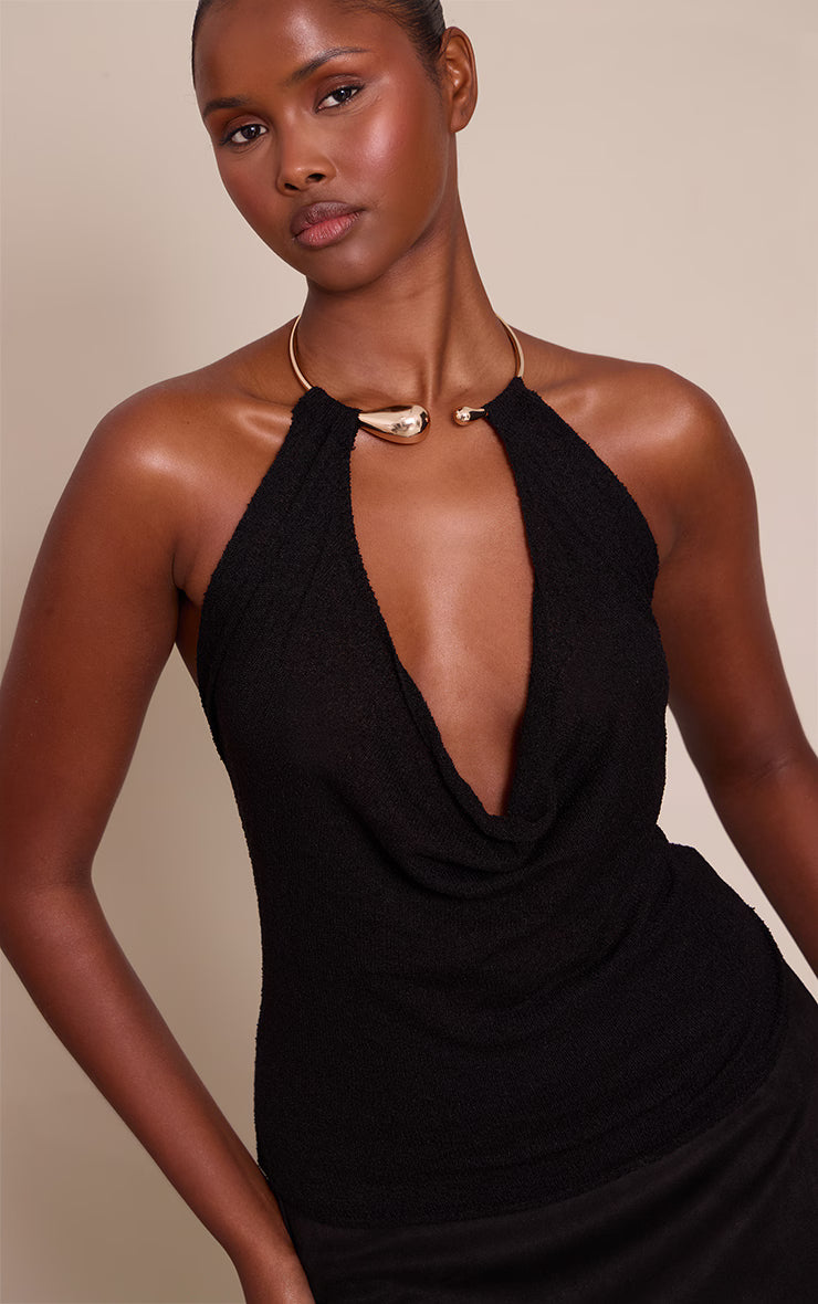 Master the art of impact with a knowing edge. The black gold cuff detail knitted top presents a bold halter neckline, featuring a striking cowl plunge that frames the décolletage, complemented by the distinctive gold neck embellishment. Its sleek silhouette contours subtly, creating a refined profile perfect for evening. Pair this standout piece with high-waisted tailored pants for a streamlined ensemble, completing your look with sharp pointed heels and subtle gold earrings. This top ensures an entrance that is both confident and undeniably chic.