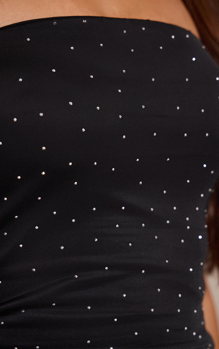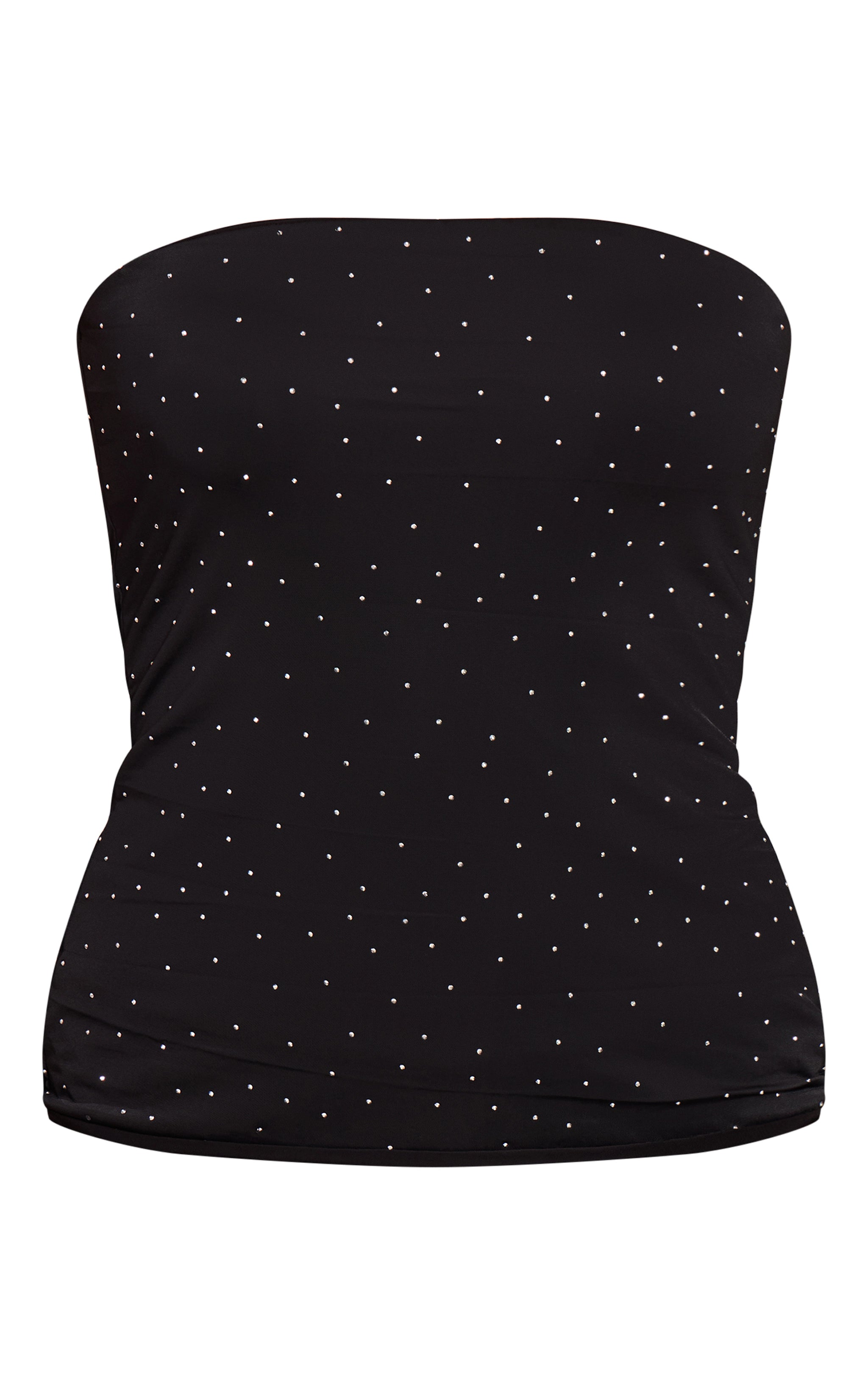 Make a confident statement this season with the black hotfix slinky bandeau top. This essential evening piece commands attention with its strapless bandeau cut and all-over hotfix embellishment, designed to shimmer as you move. A subtly ruched silhouette ensures a flawless fit. For an undeniable evening aesthetic, style yours with the matching high-waisted shorts or tailored black pants, complemented by sleek black high heels and a touch of gold jewelry.