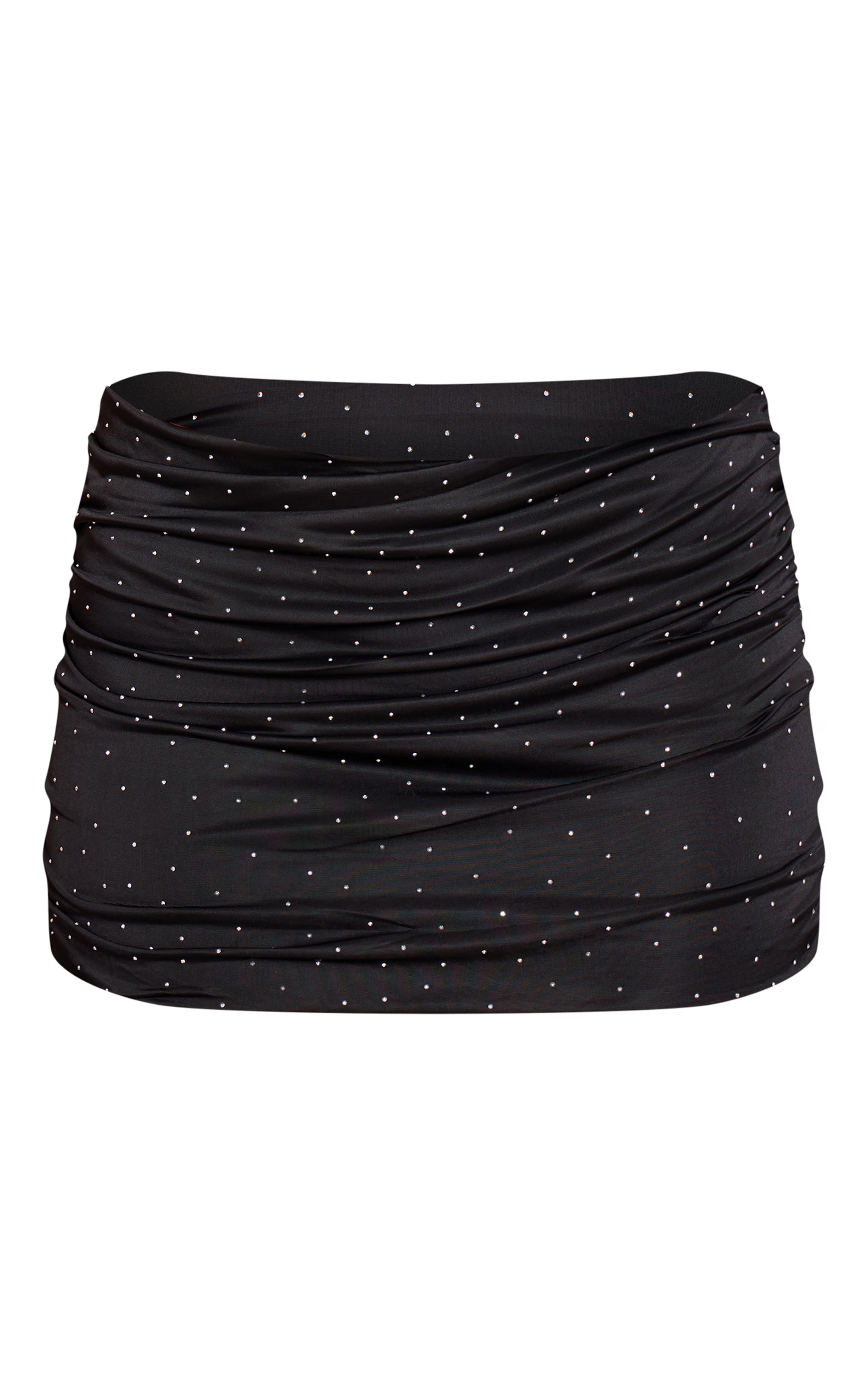 The spotlight is yours. This black hotfix slinky ruched side mini skirt ensures you make an entrance, featuring shimmering hotfix embellishments throughout its micro length. An artfully ruched side defines its shape, creating a bold, contemporary silhouette designed for maximum impact. Pair it effortlessly with a coordinating one-shoulder top and sleek black kitten heels, adding some delicate gold bracelets for a distinguished evening aesthetic.