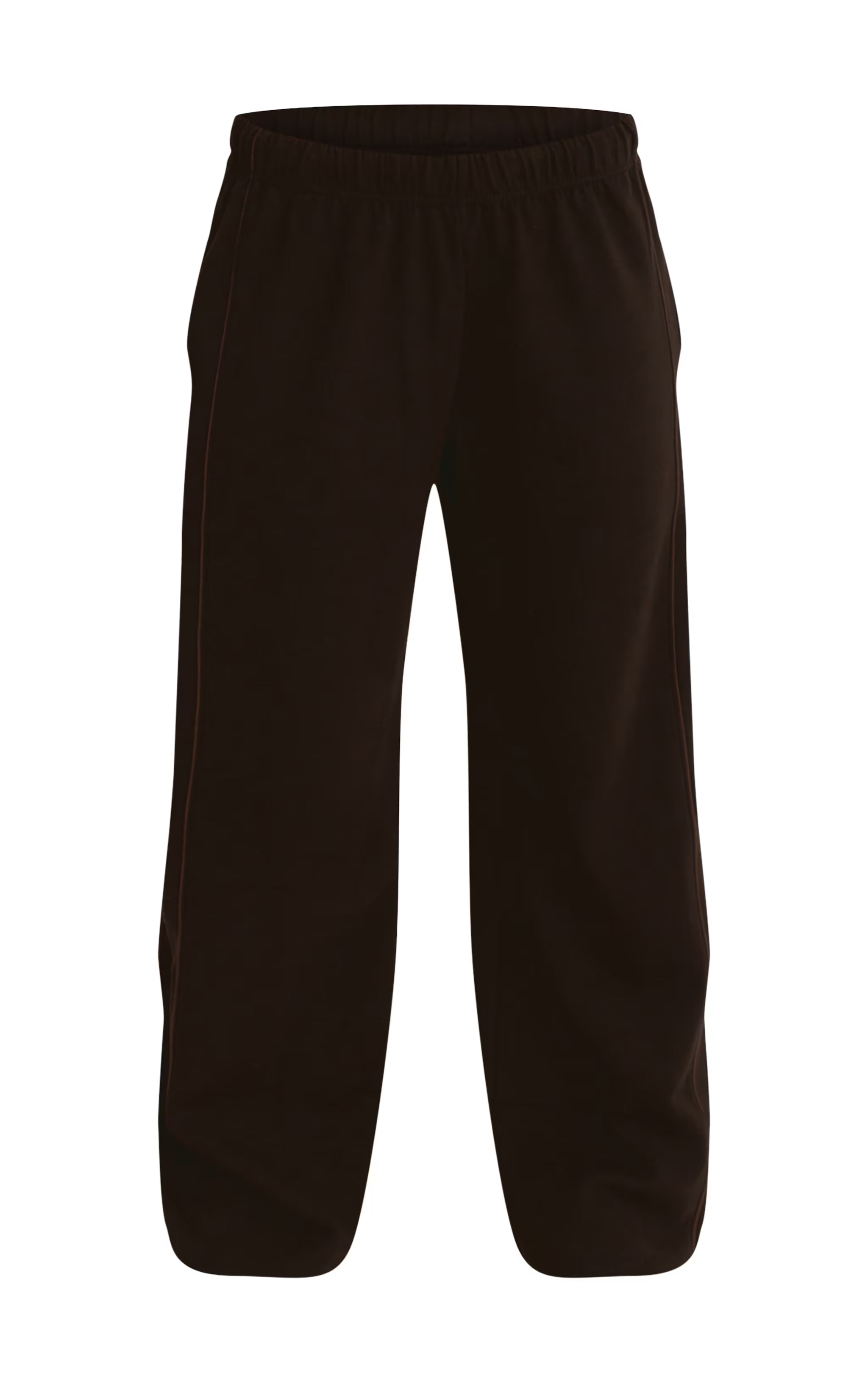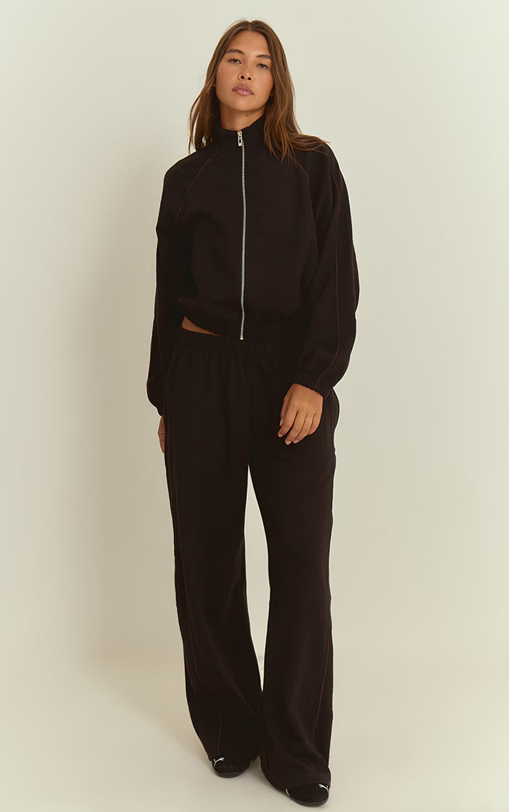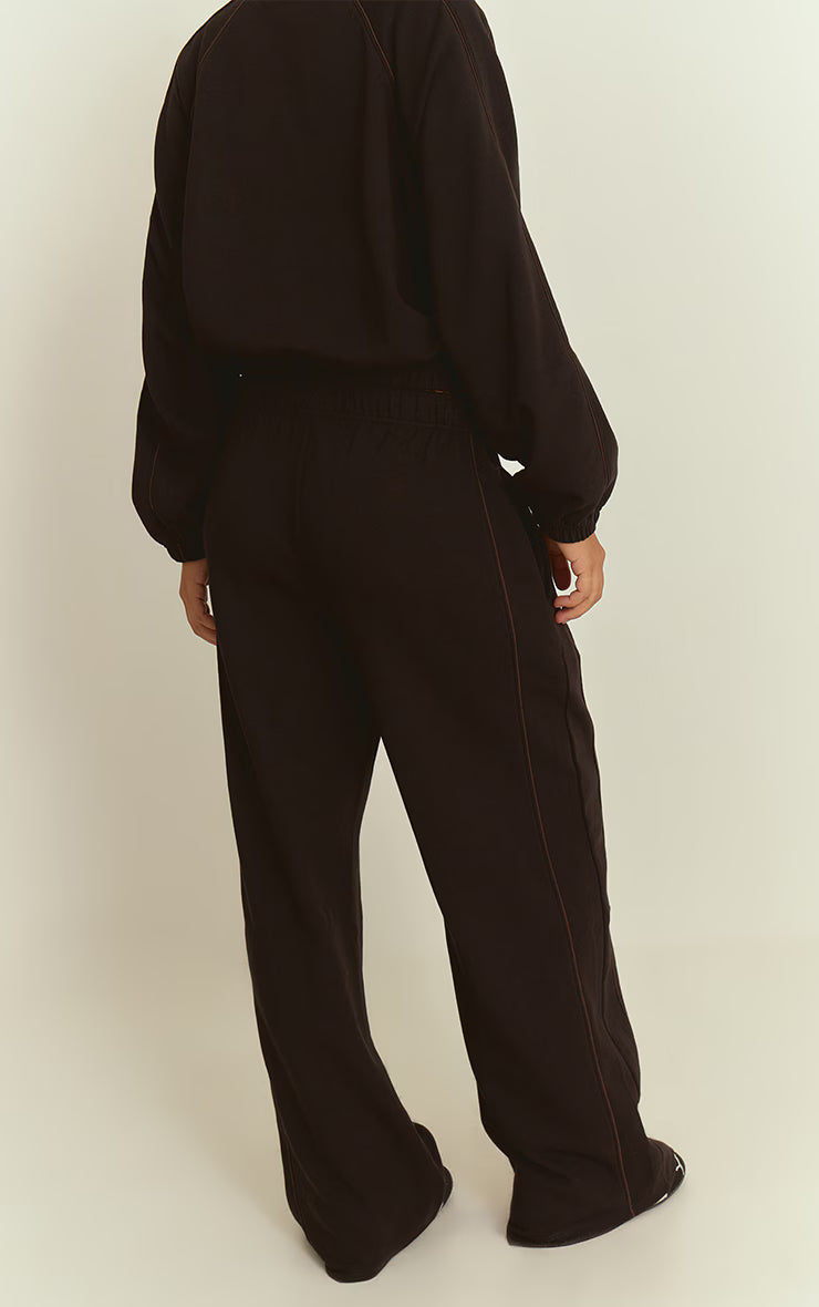 Command your day with elevated comfort. The black interlock contrast piping wide leg sweatpants deliver a knowing blend of relaxed silhouette and sharp detail. Their generous wide leg cut and elasticated high waist offer an assured profile, subtly framed by crisp contrast piping that traces the outer seams. For a confident day look, pair them with a sleek fitted top or an oversized Graphic sweater. Elevate the ensemble effortlessly with sharp metallic heels and a chic black bag, creating a versatile piece that speaks to your confident, knowing style.