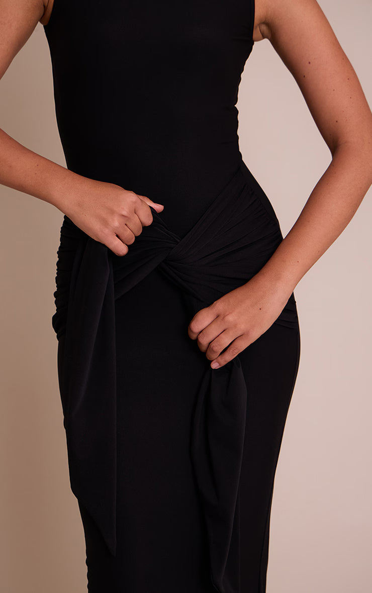 Your definitive statement in streamlined daywear. The black jersey boat neck wrap detail maxi dress champions a sleek, close-fitting silhouette, featuring a confident boat neckline and a distinctive wrap detail at the waist that artfully shapes the form before cascading to a refined maxi length. This sleeveless design offers a knowing versatility for any day occasion. Complete your ensemble with a pair of edgy chunky boots and subtle gold earrings for an effortlessly polished look that asserts contemporary style.