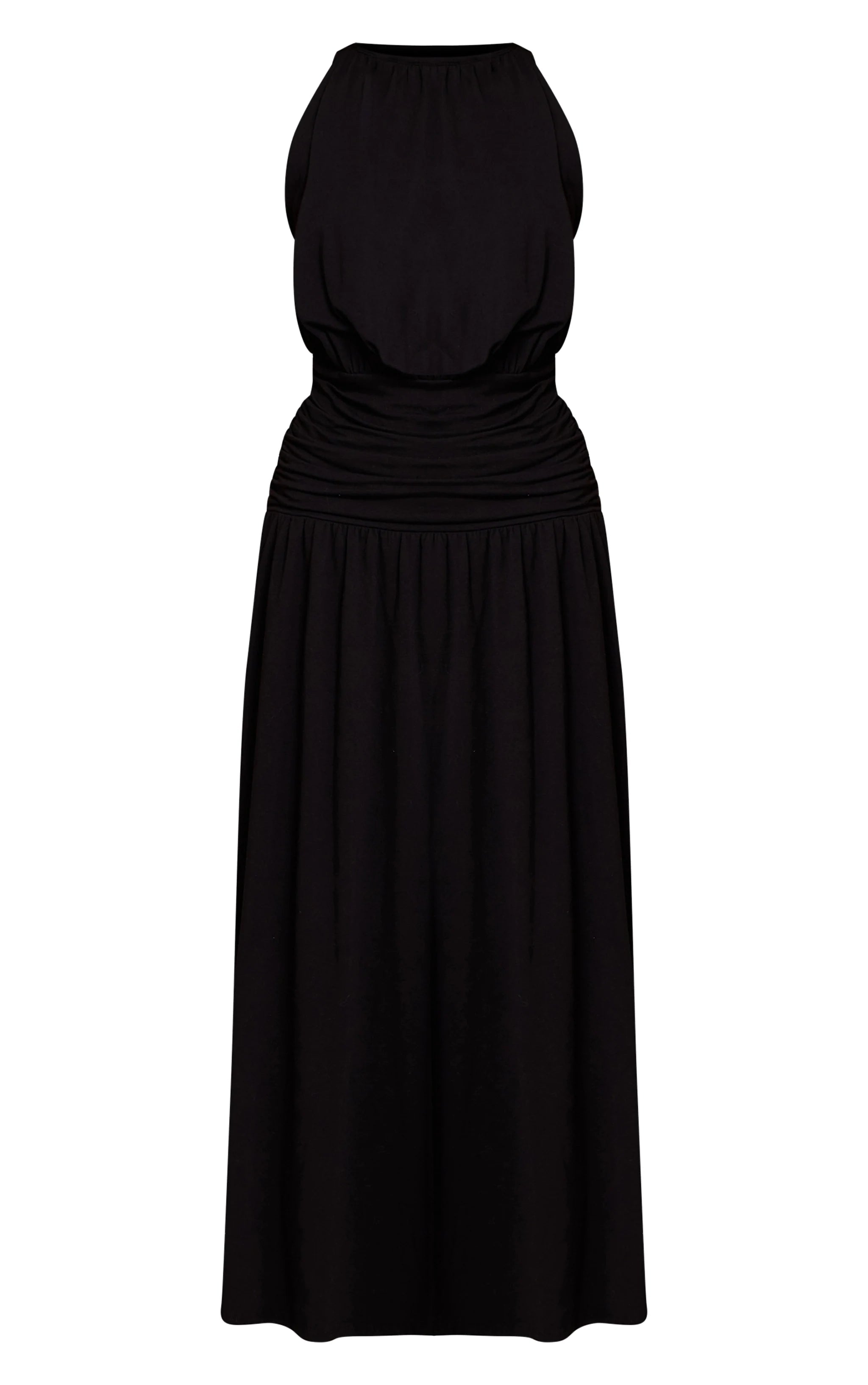 Master the art of understated elegance with the black jersey halterneck ruched detail maxi dress, an essential piece defined by its high halter neckline and artfully ruched waist. The design offers a sophisticated balance, flowing effortlessly from the cinched waist to a sweeping maxi skirt. Perfect for day plans, its versatile design works just as well with platform heels for an elevated edge, complemented by a minimalist black bag. A confident choice that proves simplicity is always in vogue.