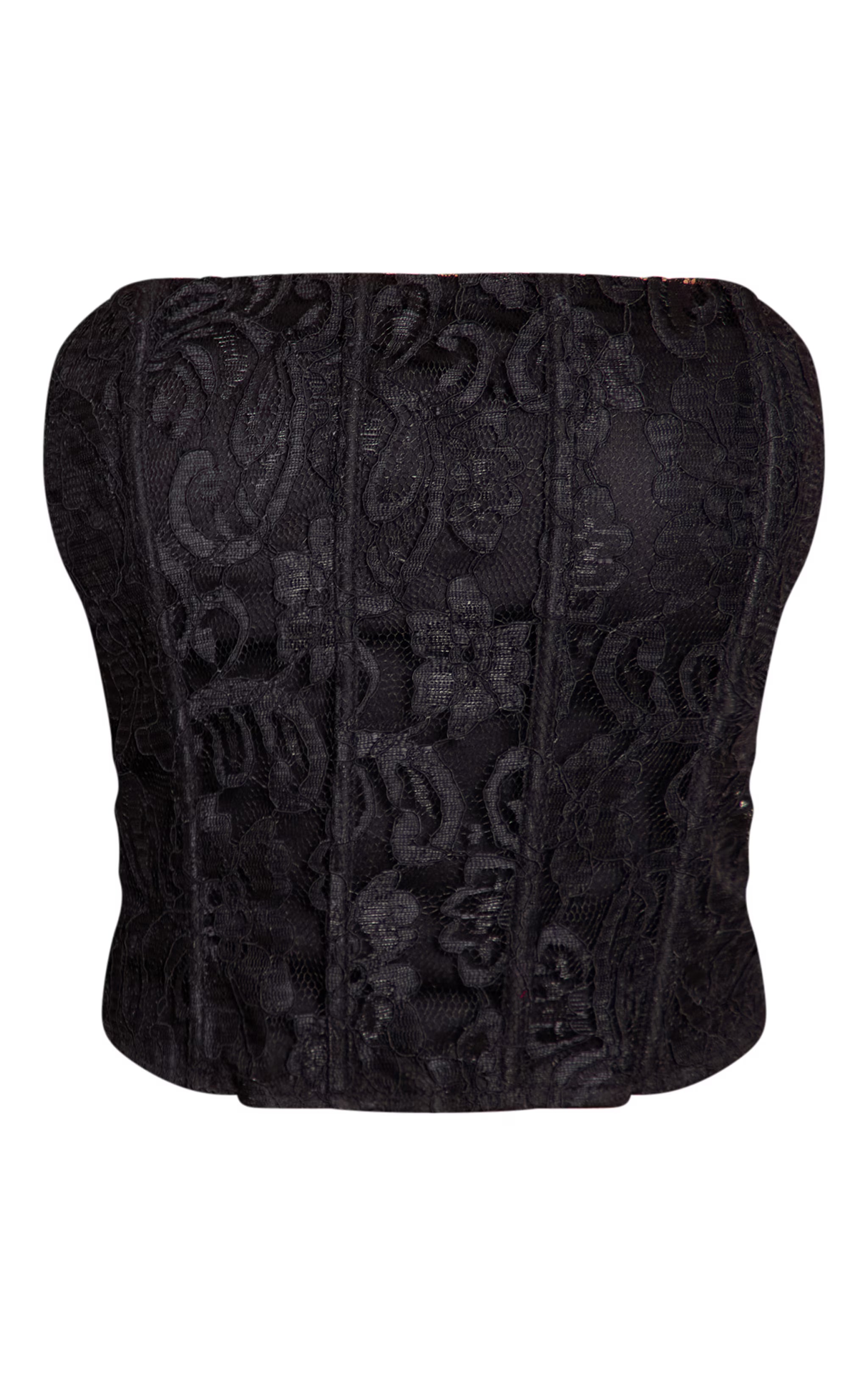 Own the night in the black lace boned bandeau corset top. Crafted from delicate floral lace with internal boning, the bandeau cut sculpts and supports while sitting sleek against the body. Pair with a satin midi skirt and gold accessories for an elegant after-dark look.
