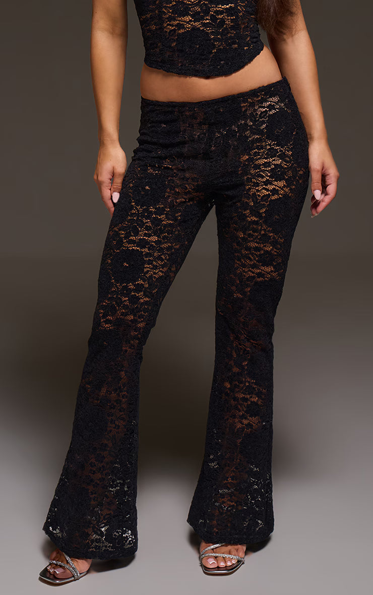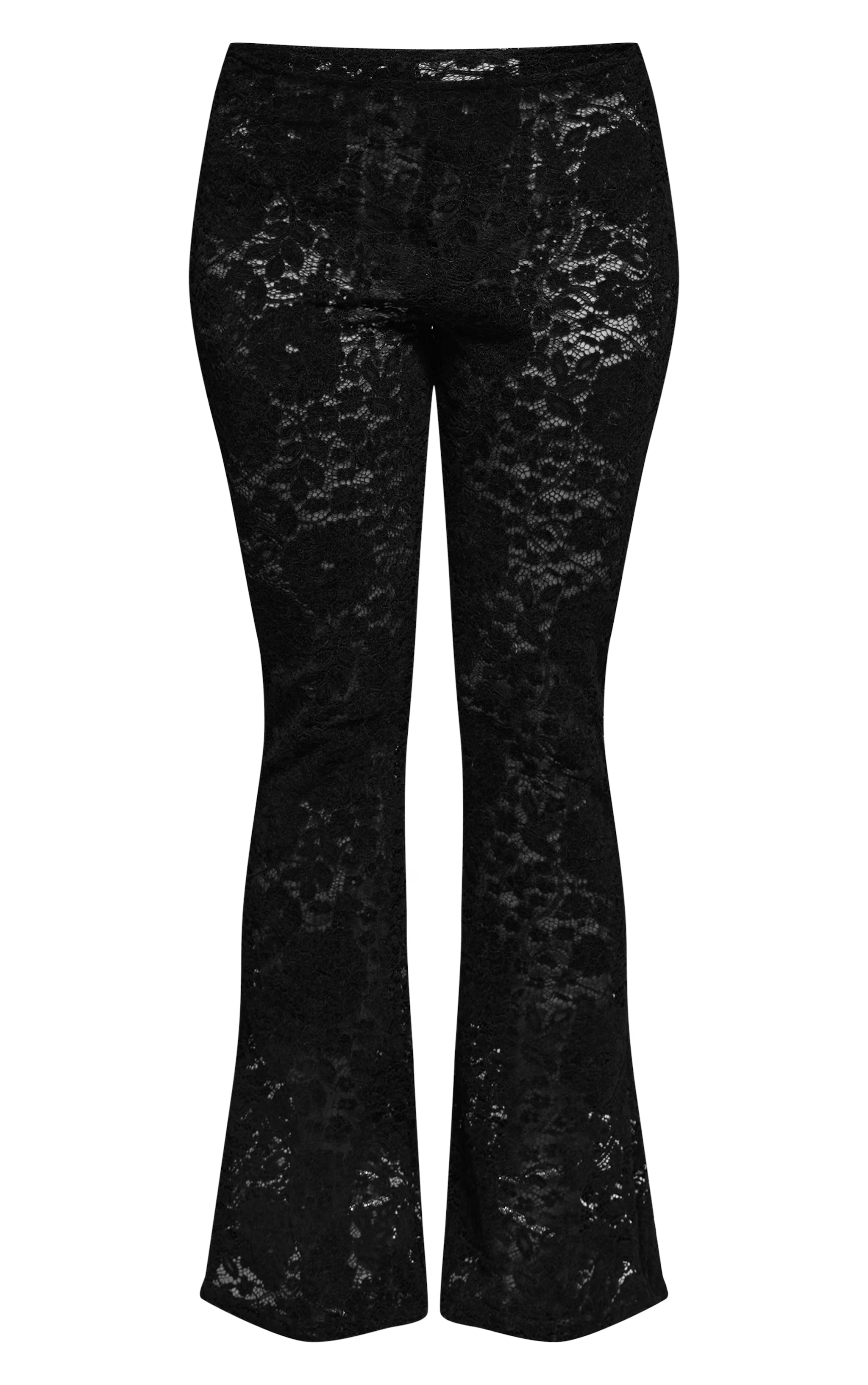 Own the night with an intricate edge. These black lace mid rise skinny flares introduce a knowing touch to your evening ensemble, featuring a confident mid-rise waist that elongates the frame and a sleek, skinny silhouette that gracefully flares from the knee. The delicate all-over lace pattern adds an artful dimension, offering a refined transparency. Pair these statement pants with the coordinating lace square-neck top for a cohesive look, or opt for a crisp white shirt for an unexpected contrast. Ground your ensemble with sleek closed toe heels and a matching clutch bag, asserting a polished presence that is both bold and effortlessly refined.