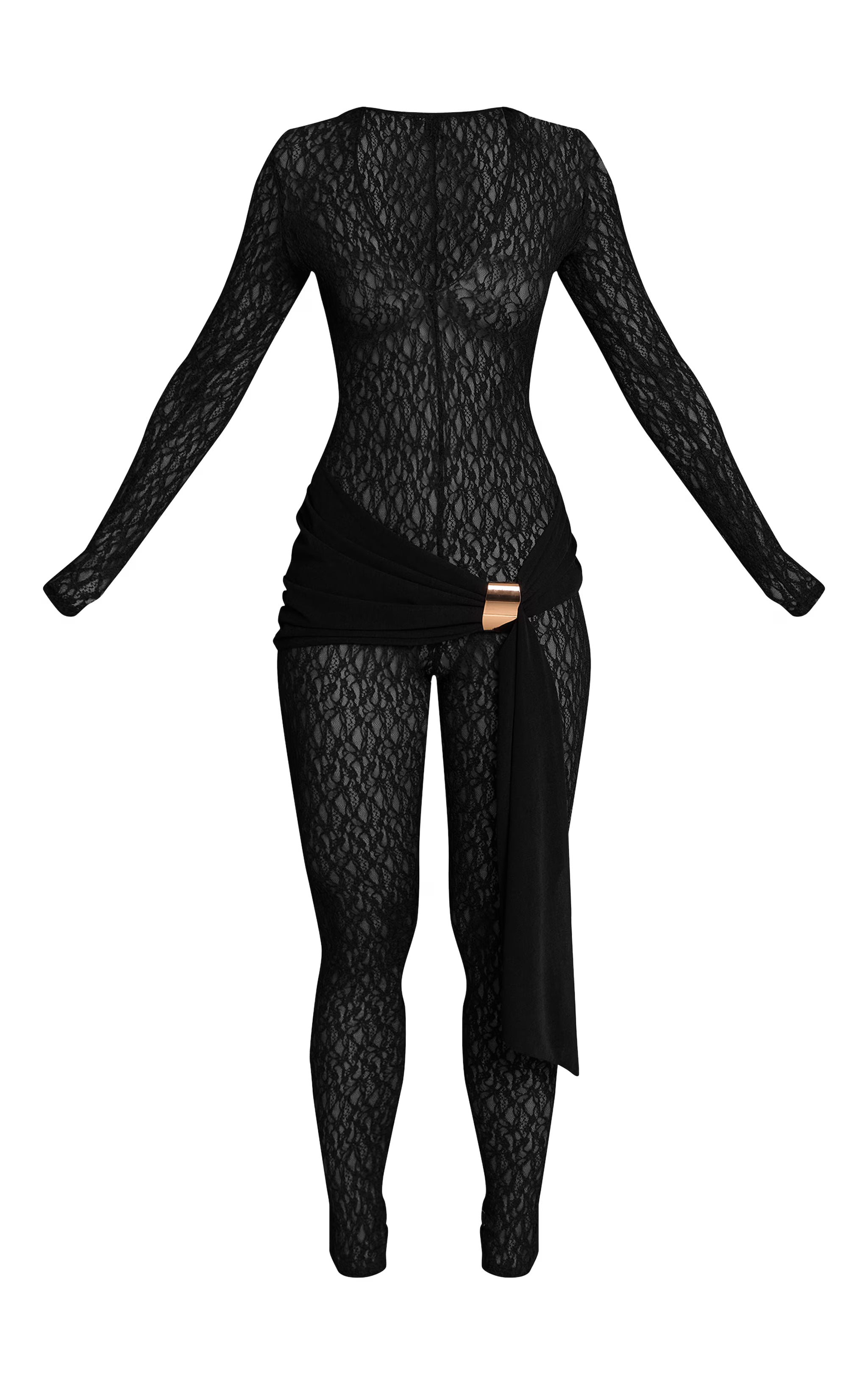 Sculpting lines meet bold design for an undeniable evening presence. This black lace wrap detail jumpsuit commands attention with its intricate lace pattern, plunging V-neckline, and long sleeves. A distinctive wrap detail cinches the waist, accented by a striking gold-tone buckle, creating a sharp, elongated silhouette. Style this powerful look with sharp kitten heels and subtle gold stud earrings to amplify its refined edge, perfect for exclusive evening events. It’s a confident statement designed for the modern professional who knows how to own the night.