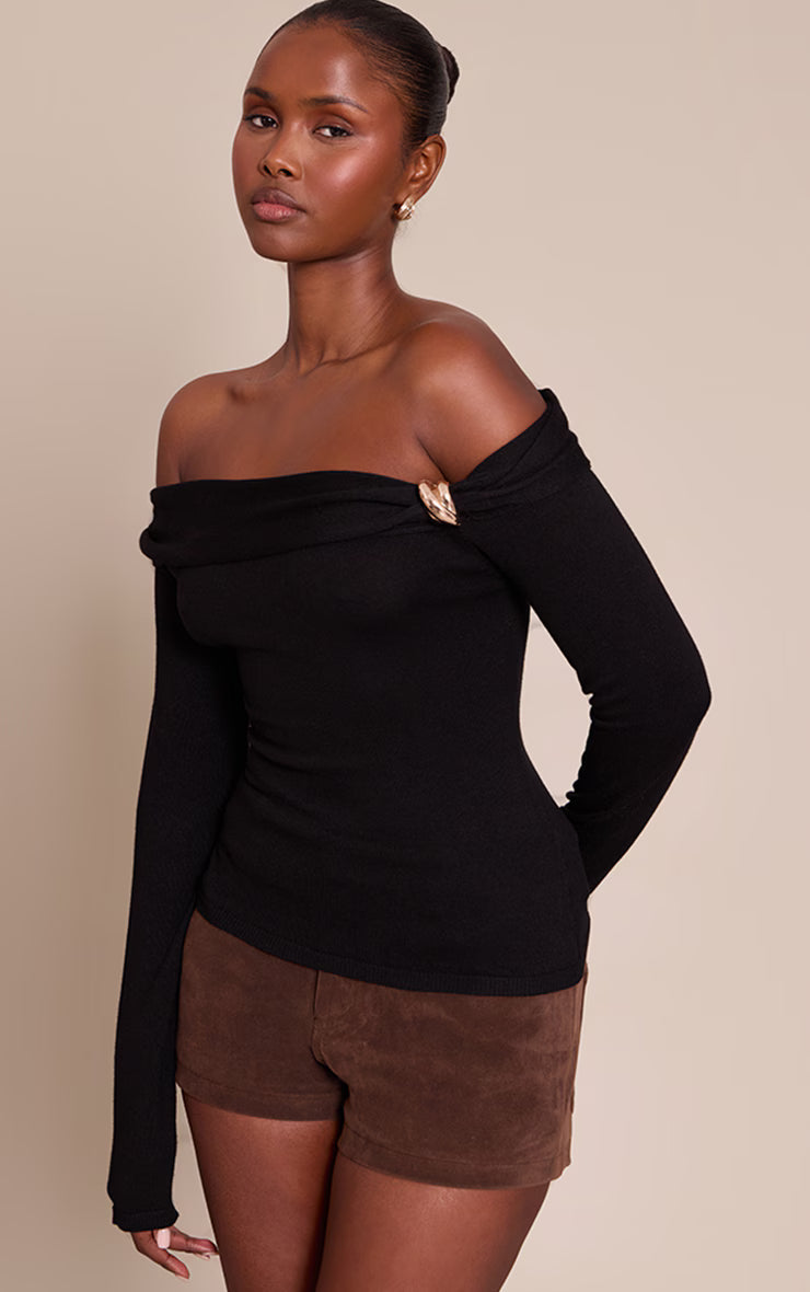 Anchor your evening wardrobe with an effortlessly chic statement; the black long sleeve twist shoulder detail knitted top delivers on sophisticated allure. Its off-shoulder neckline frames the décolletage with an artful drape, while the unique twist detail on one shoulder is cinched by a striking gold-tone accent, elevating the long-sleeve profile. For a confident evening aesthetic, pair this piece with sleek faux leather pants or a tailored mini skirt, finishing the look with some sharp knee high boots and a minimalist black bag, ensuring your style is unforgettable from dusk till dawn.