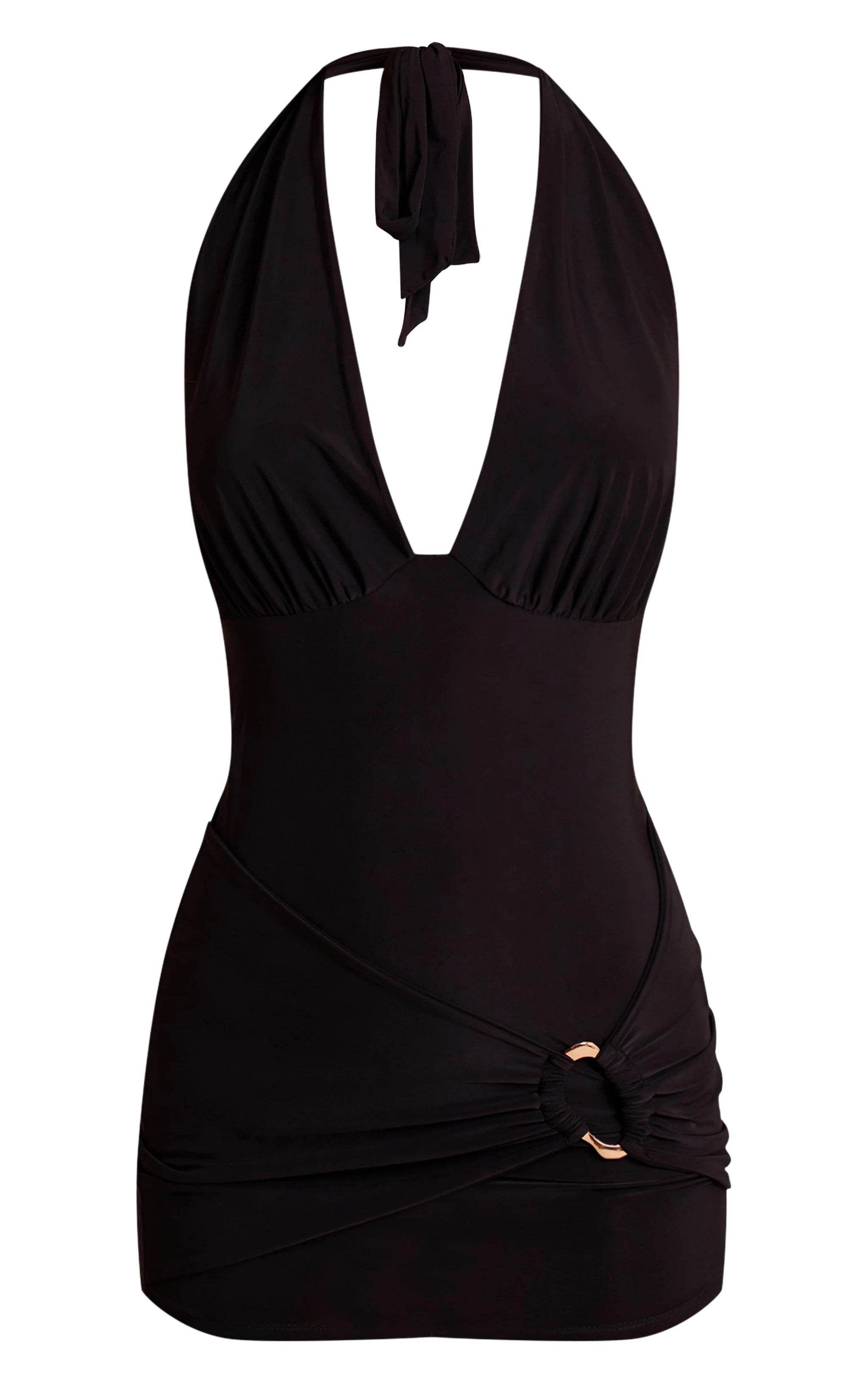 Channel sophistication in the black plunge trim detail wrap mini dress. Crafted from smooth woven fabric in black, this dress features a deep plunge neckline and wrap design accentuated with tailored trim detailing. Style with strappy heels and gold accessories for a statement evening ensemble.