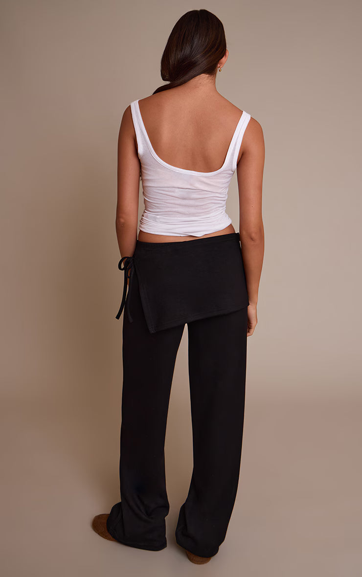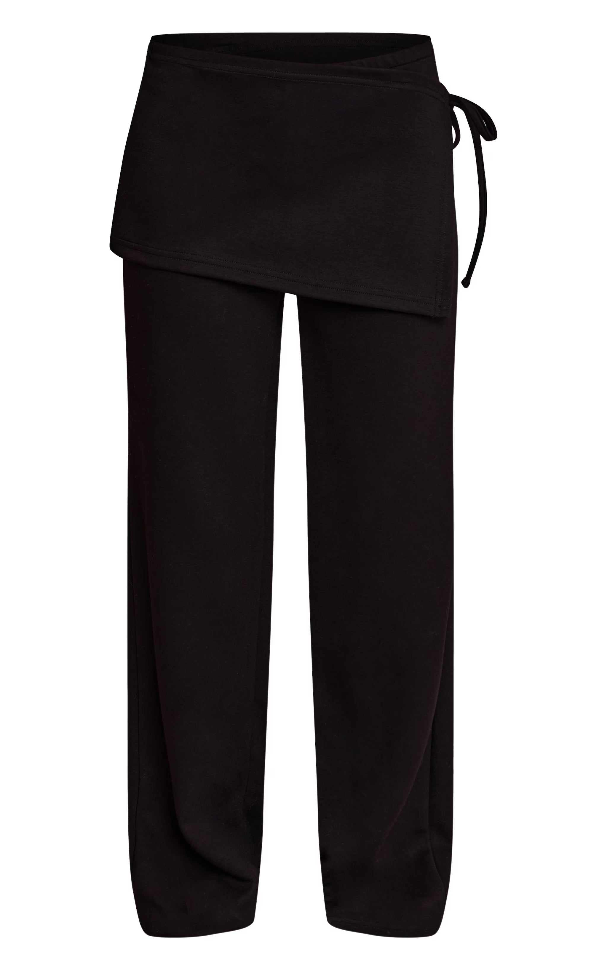 Command attention with a contemporary cut that blurs the lines between comfort and elevated design. The black premium soft touch wrap front wide leg pant introduces a knowing edge to your everyday wardrobe, featuring a confident wide-leg silhouette that flows elegantly, complemented by a distinctive wrap-front detail and a self-tie fastening that refines the waist. Pair with a crisp fitted shirt or an oversized sweater for a versatile day ensemble, grounding the look with sleek boots and a subtle nod with gold stud earrings for an effortlessly polished aesthetic that's undeniably artful.