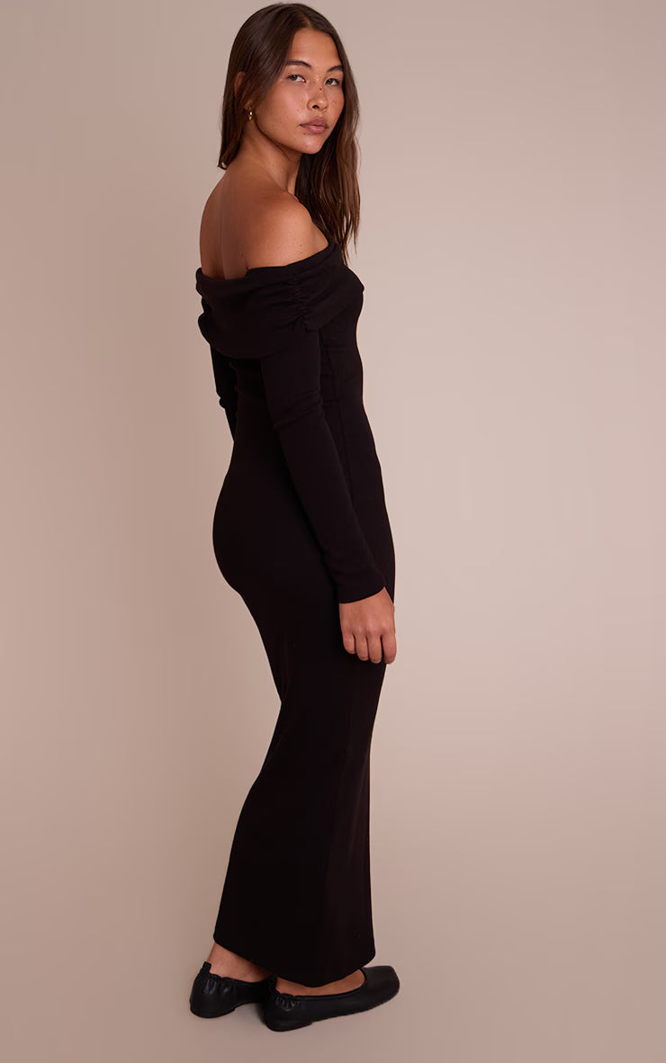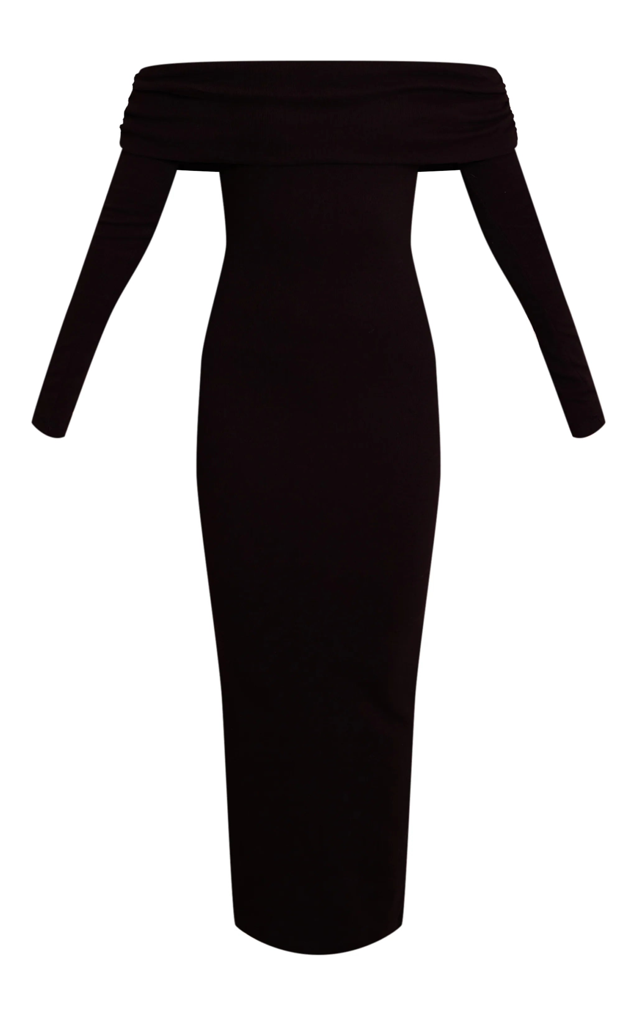 Turn heads with the black ribbed fold over bardot long sleeve maxi dress. Crafted from soft ribbed fabric in a timeless black hue, this piece features a fold-over bardot neckline and fitted maxi silhouette. Style with pointed heels and a clutch for understated evening sophistication.
