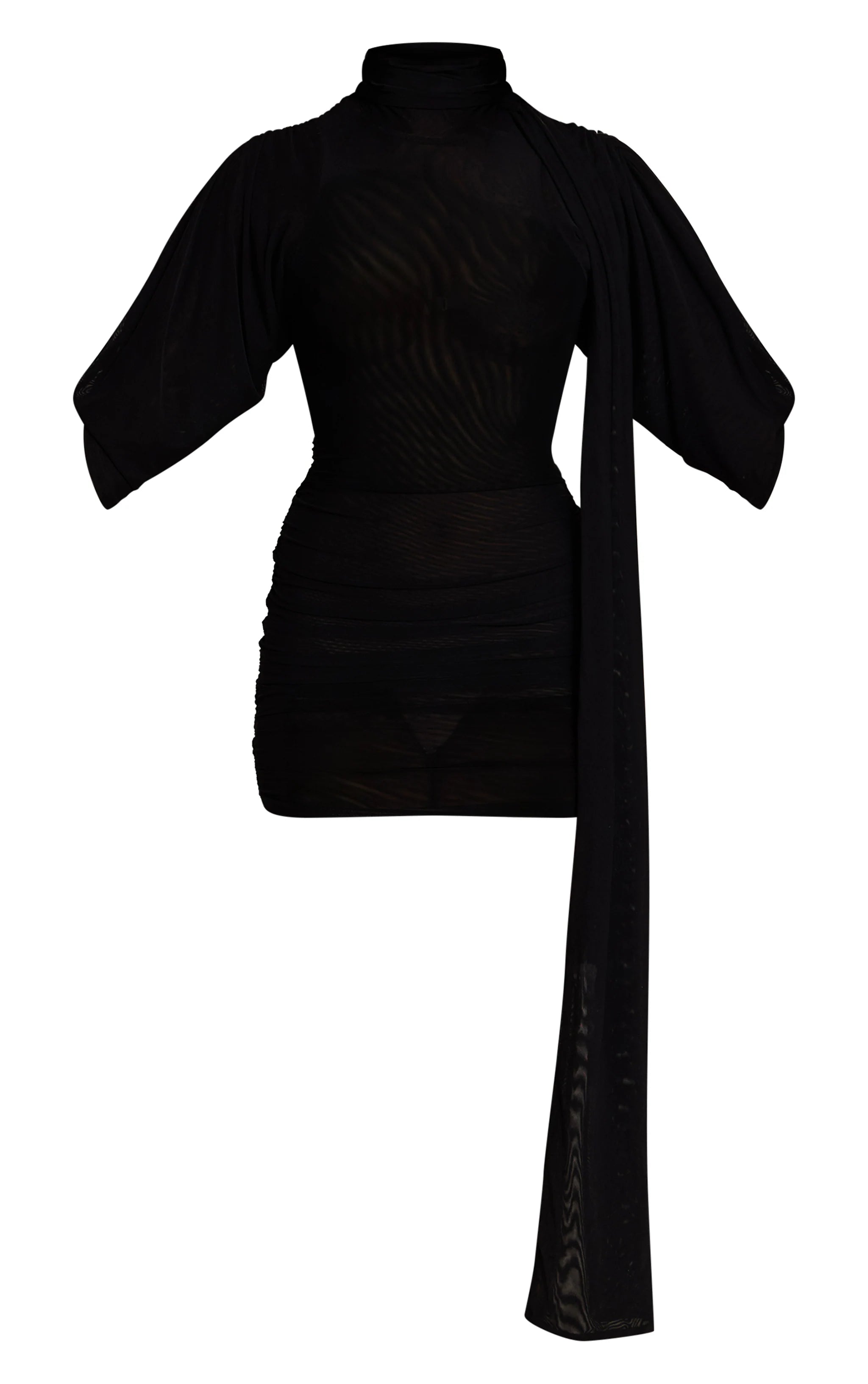 Elevate your evening attire with the black ruched wrap bodycon mini dress. Designed from sculpting stretch fabric in a rich black hue, it features a wrap silhouette with ruched detailing that accentuates your curves. Style with pointed heels and a statement bag for a refined party look.