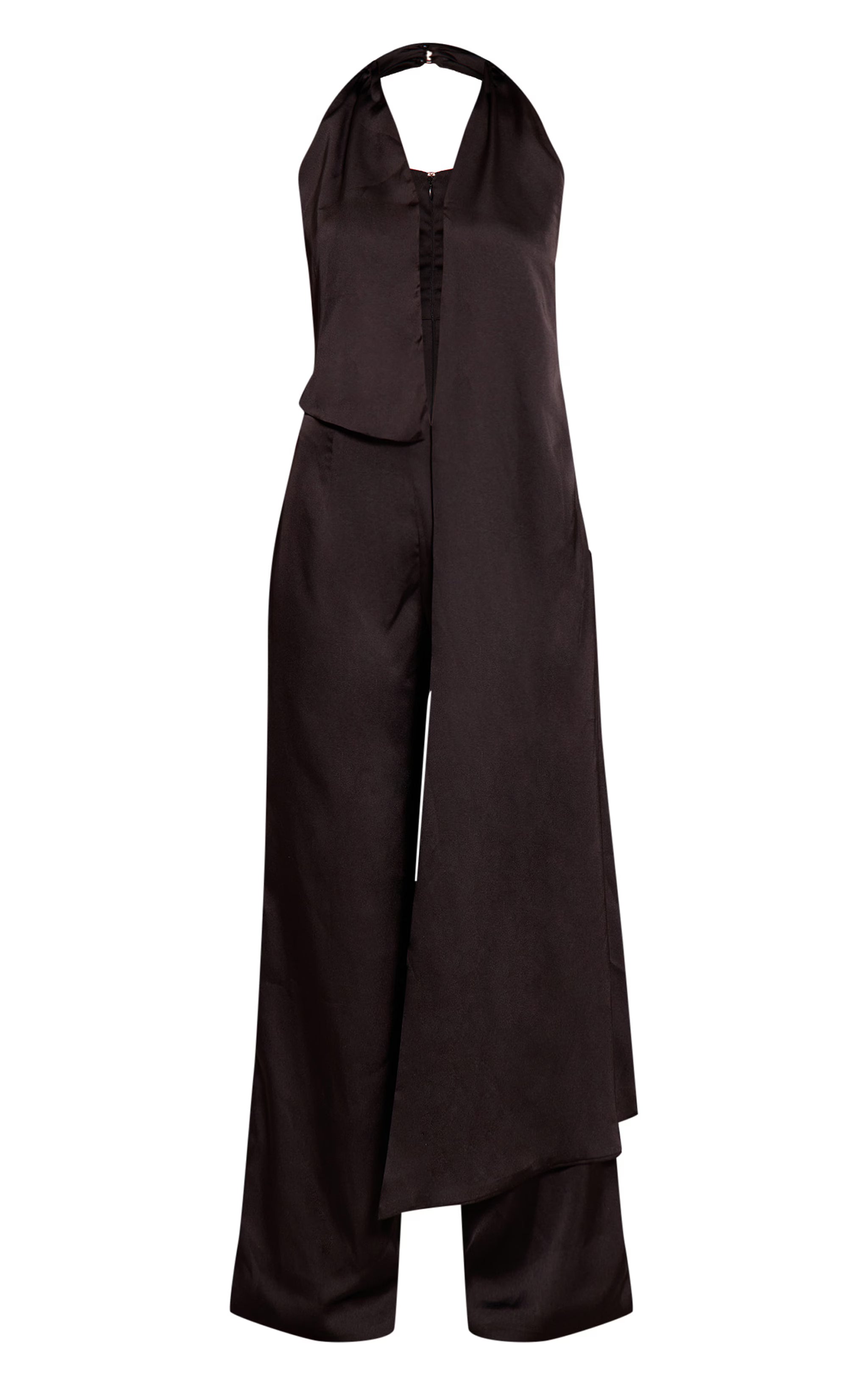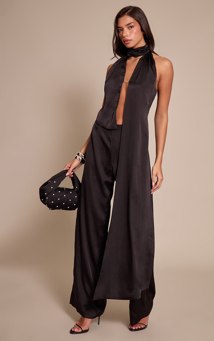 The evening calls for a truly distinctive aesthetic. The black satin drape wide leg jumpsuit embodies modern drama, featuring a plunging halter neckline that melts into an expertly draped bodice. An extended sash panel creates an intriguing, flowing silhouette, complementing the wide leg cut that moves with refined nonchalance. Complete the ensemble by pairing this with towering high heels and a selection of bold silver jewelry for a self-assured presence, ideal for any elevated evening.