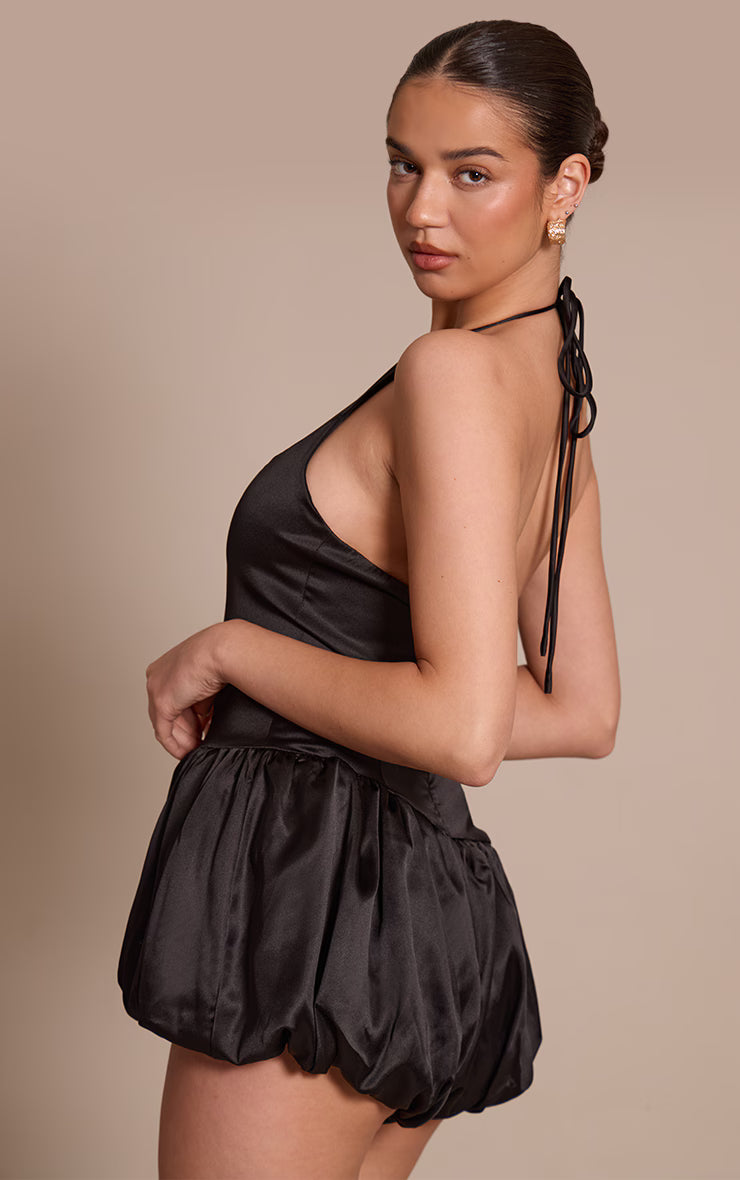 Command the room with an unapologetically bold silhouette. The black satin halterneck puff ball romper redefines evening wear, uniting a sleek halterneck that frames the collarbone with an artfully structured bodice, then cascading into distinctive puff ball shorts for a dramatic, voluminous statement. For an assured evening aesthetic, style this design with sharp black high heels to elongate the silhouette, finishing the look with striking gold jewelry. It's the knowing choice for an entrance that commands attention with self-assured elegance.