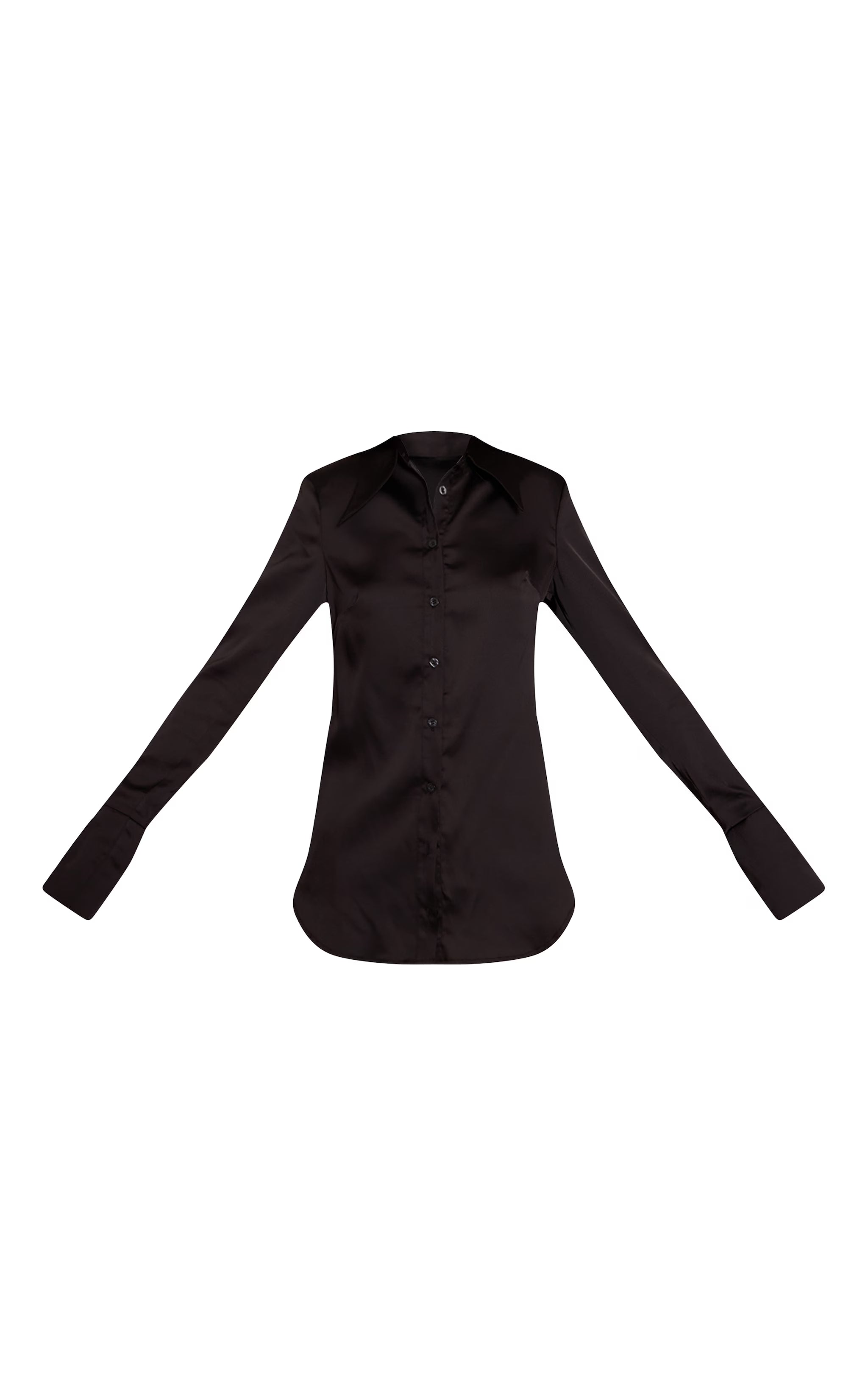 Master the art of elevated dressing with a single, impactful piece; the black satin oversized collar button down fitted shirt offers a polished silhouette designed to command attention. This essential features a striking oversized collar and full button-down fastening, creating a refined, sleek profile. Its deep black hue and long sleeves with neat cuffs enhance its sophisticated appeal, offering versatile styling options. For an assured evening aesthetic, team this top with tailored black wide-leg pants or a sharp midi skirt. Complete the look with sophisticated heeled mules and a stack of gold cuff bracelets, ensuring a confident statement that transitions seamlessly from dinner to drinks.