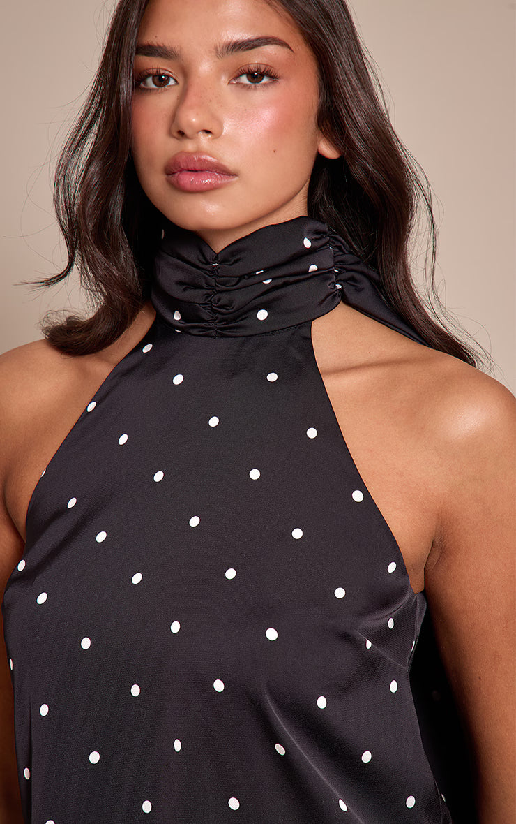 Make an undeniable entrance. The black satin poka dot scarf mini dress is designed for those who own the night, featuring a distinctive ruched halter neckline that flows into an elegant scarf tie for a high-neck effect and an alluring open back. Its mini silhouette, adorned with classic polka dots, creates a striking profile perfect for evening occasions. Team this piece with statement block heels and a sophisticated black bag, ensuring your look is pulled together with an effortless air of confidence.