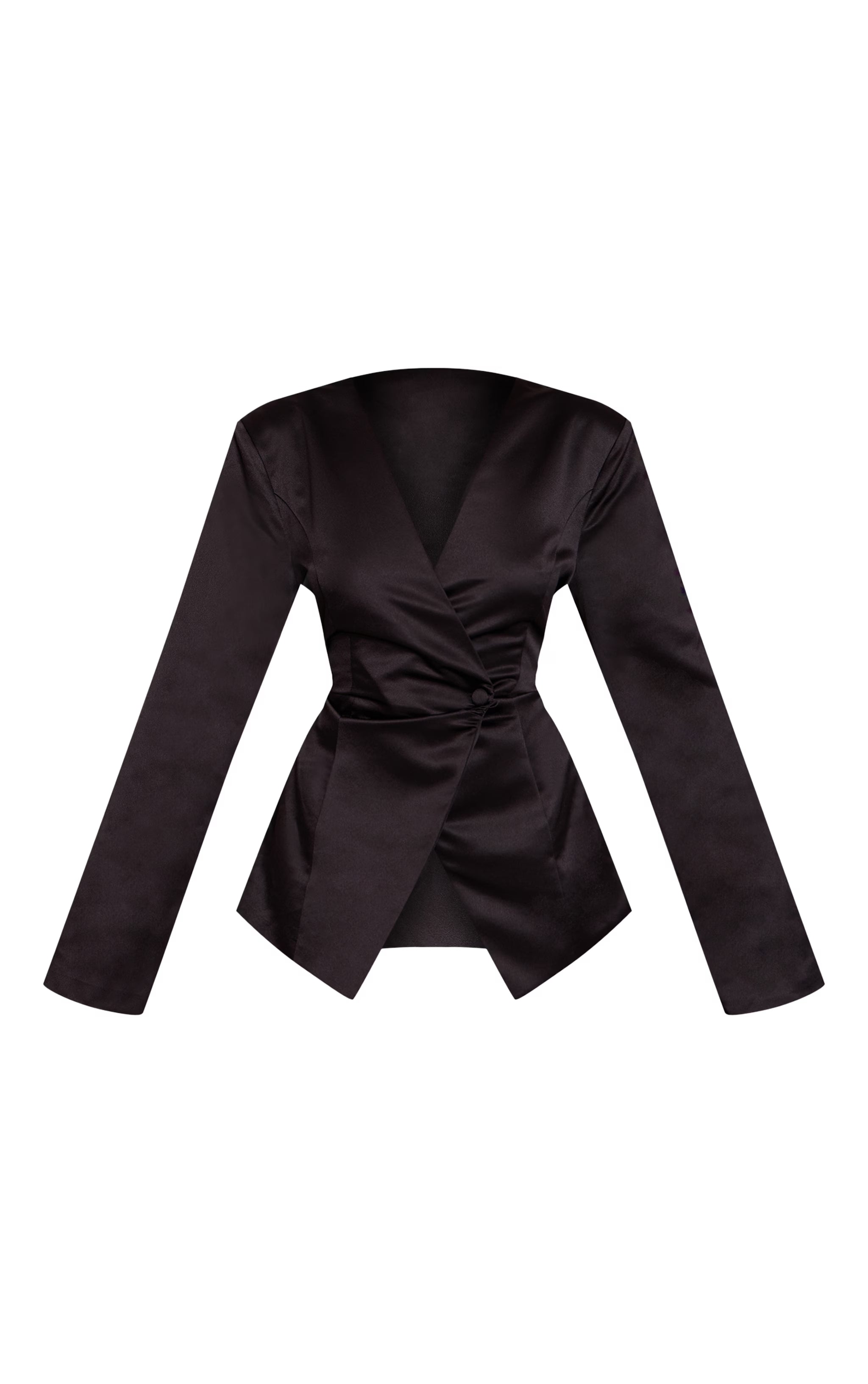 Intentionally crafted for the spotlight, the black satin ruched cinched blazer delivers a modern take on evening tailoring. It features a striking deep V-neckline that leads to a precisely ruched and cinched waist, secured by a single subtle button. Structured shoulders define its commanding silhouette, while the sleek black satin finish provides an elevated aesthetic for any occasion. Team this blazer with coordinating tailored pants for a cohesive two piece set, or wear it over a slip dress for a confident evening ensemble. Finish the look with sharp knee high boots and minimal gold accessories to truly embody refined power. This piece is your ultimate statement for after-dark confidence.