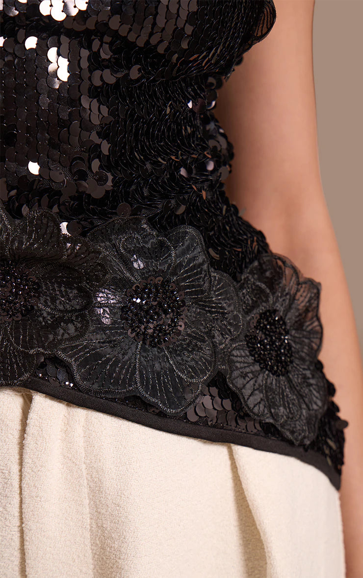 For moments that demand a distinct edge, look no further than this black sequin flower detail asymmetric top. It champions a knowing glamour with its all-over sequin embellishment, while artfully placed 3D flower detailing adds depth. The flattering asymmetric cut sweeps elegantly across the torso, and a chic halter neckline offers a modern, confident appeal. Style yours with tailored wide-leg pants and sleek gold heels for a powerful evening ensemble, complemented by delicate gold earrings to let the top truly shine. The ultimate piece for a refined, confident statement after dark.