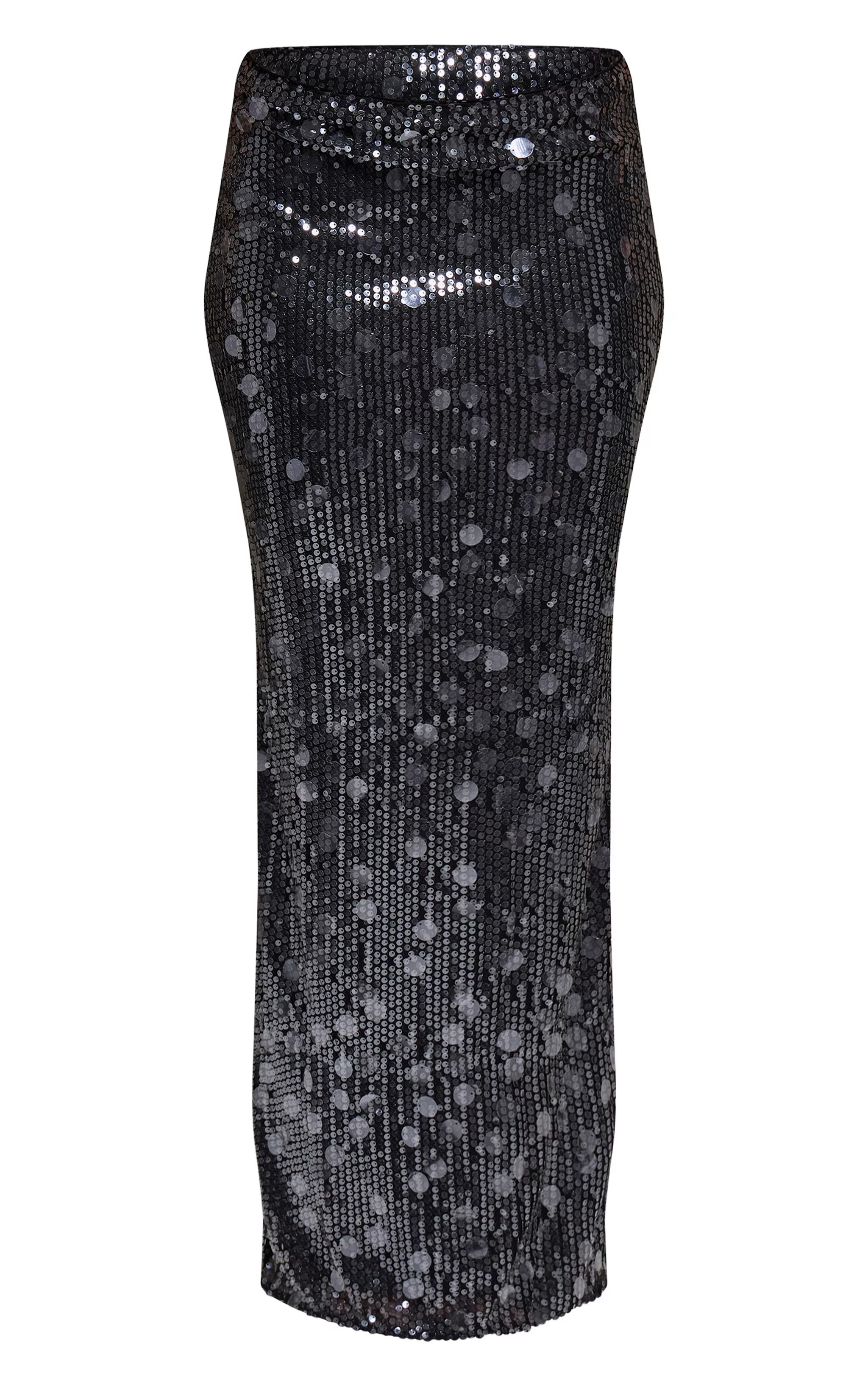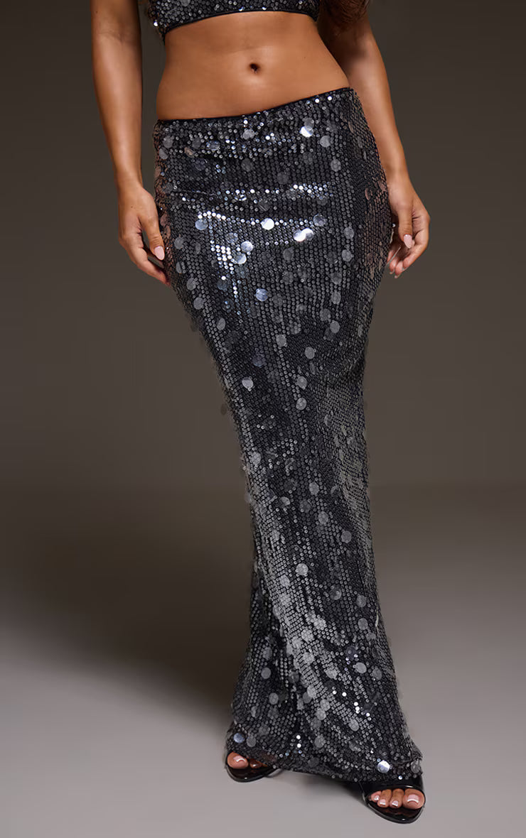 Shine with confidence in the black sequin high waisted maxi skirt. Designed in a black sequin fabric for maximum impact, this skirt offers a flattering high-waisted fit. Team with a chic crop top and strappy heels for a glamorous occasion look.