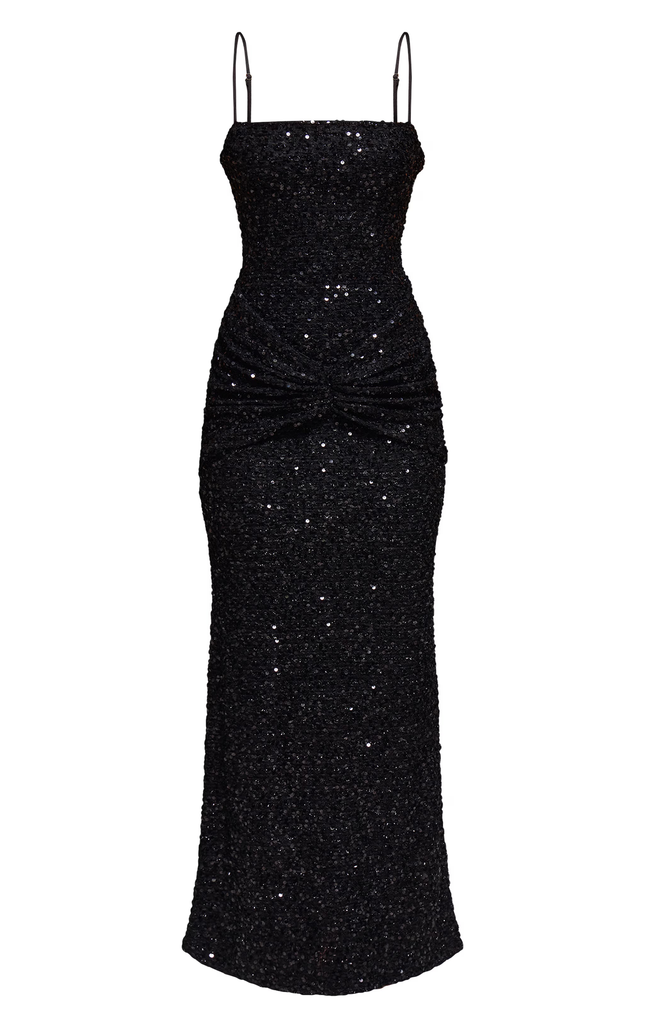 Dazzle your way through any occasion in the black sequin wrap detail strappy maxi dress, a piece designed to captivate. This striking maxi dress features a flattering square neckline and adjustable straps, with intricate ruching detail that artfully cinches the silhouette. Elevate this statement piece for an evening out by pairing it with chic high heels and completing the look with delicate drop earrings for an ensemble that commands attention.