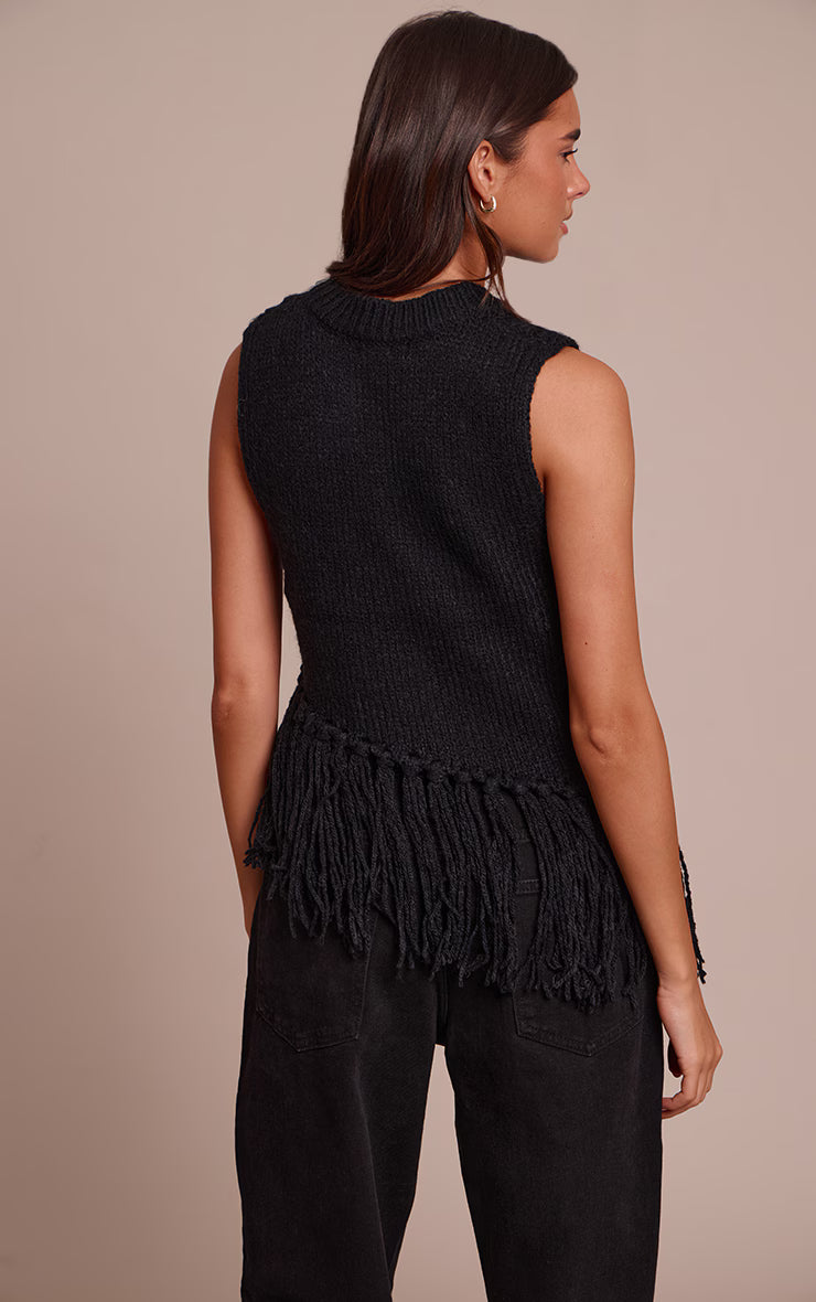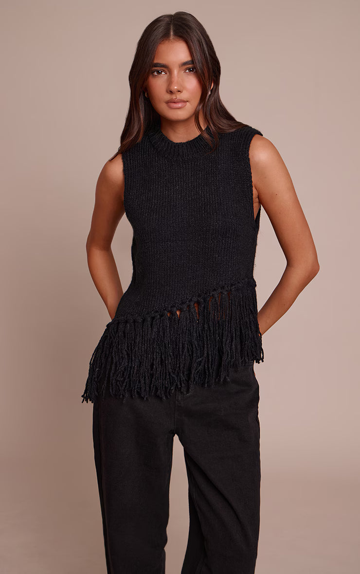 The classic knit takes a bold turn with a distinct, artful edge. This black sleeveless fringe detail sweater makes a confident statement, featuring a high crew neckline and an eye-catching diagonal fringe detail that cascades across the hem, creating a dynamic silhouette. Layer this knowing piece over a crisp white shirt or wear it solo with sleek tailored pants, allowing its unique embellishment to truly shine. Finish your look with confident cowboy boots and a pair of delicate gold earrings for an effortlessly composed aesthetic that transitions seamlessly through your day.