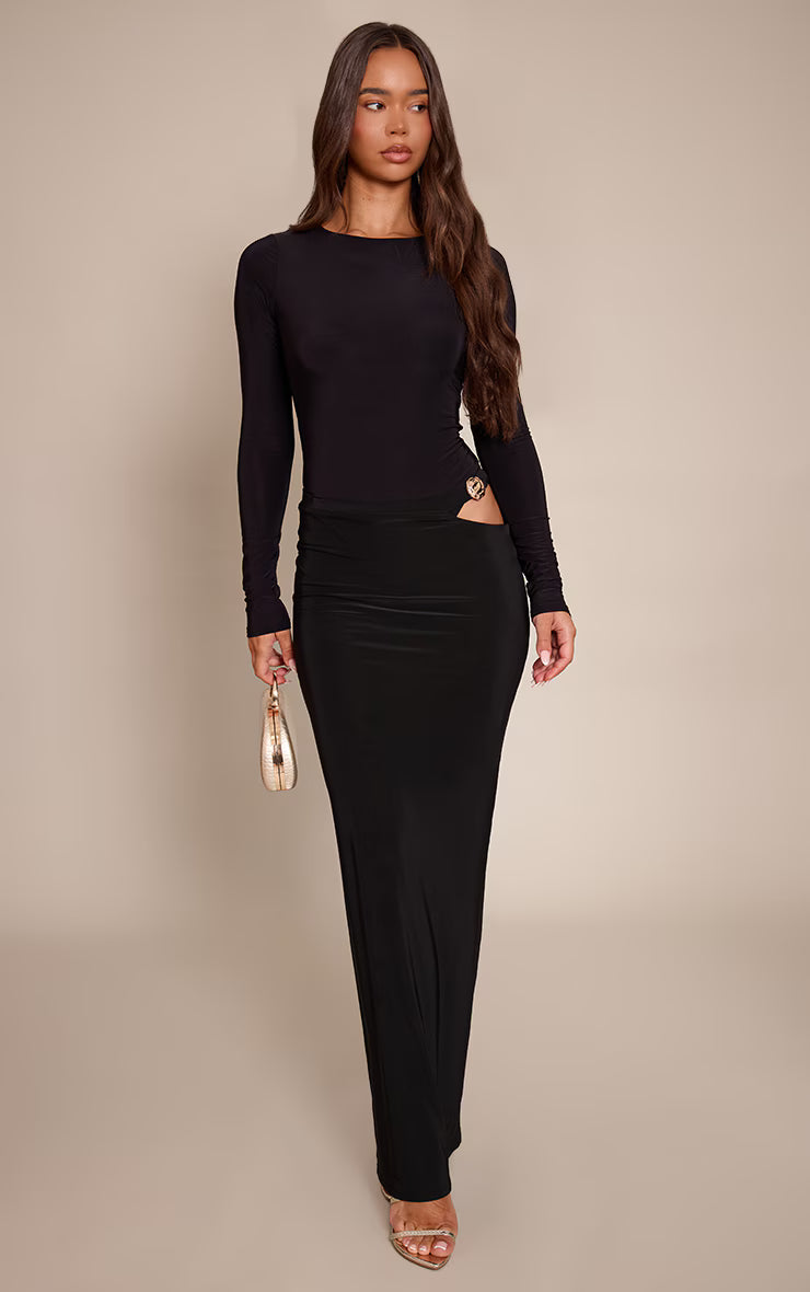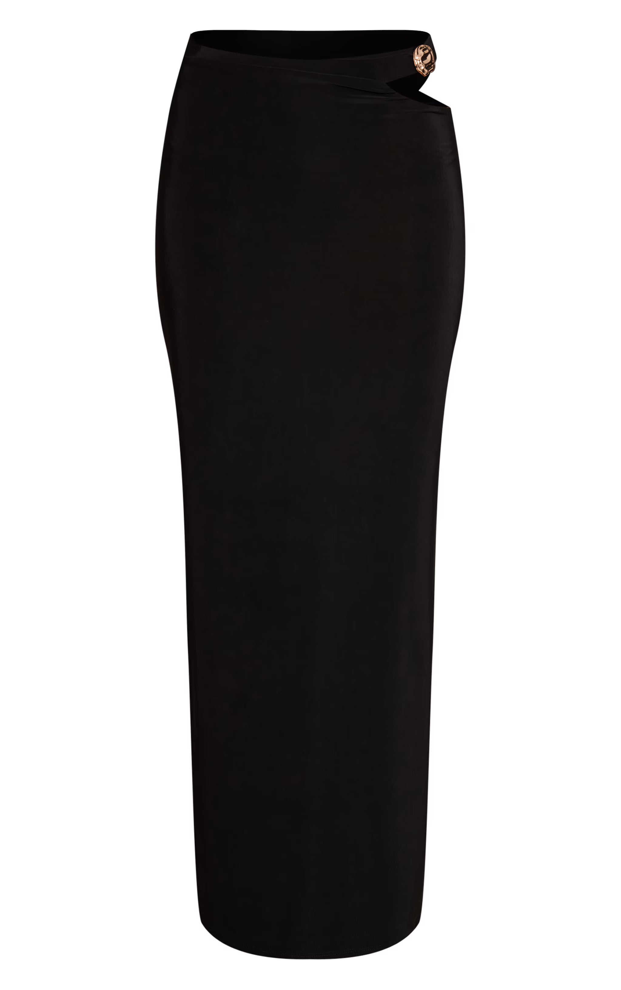 Project unapologetic confidence into the night; the black slinky cut out trim detail maxi skirt ensures your presence is felt. Its elongating maxi length creates a striking silhouette, beautifully complemented by the artful hip cut-out, which features a distinctive trim detail. Pair this sophisticated piece with a sleek, fitted top and elegant small heels. Add delicate stud earrings to complete a look that speaks volumes after dark.