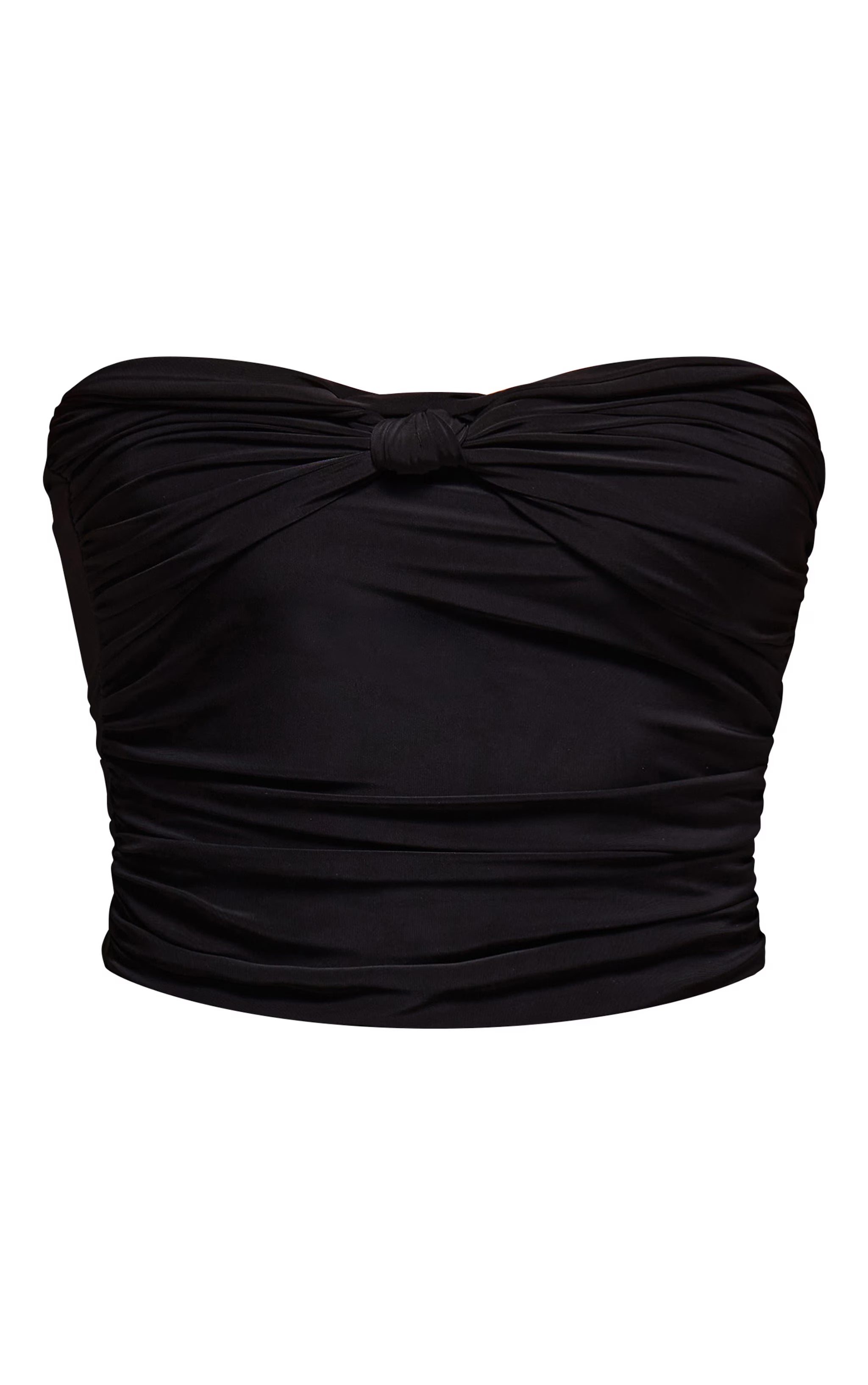 An evening staple, reimagined with an artful twist. The black slinky knot detail bandeau top offers a confident, clean-line aesthetic for your next night out. Its sleek bandeau cut frames the décolletage, while the intricate knot detail at the bust creates a subtle, knowing focal point. Pair this versatile top with sharp tailored pants or a high-waisted leather skirt to complete an elevated ensemble. Finish the look with sophisticated black heels and minimalist gold jewelry to enhance the confident neckline, ensuring your style speaks volumes effortlessly.
