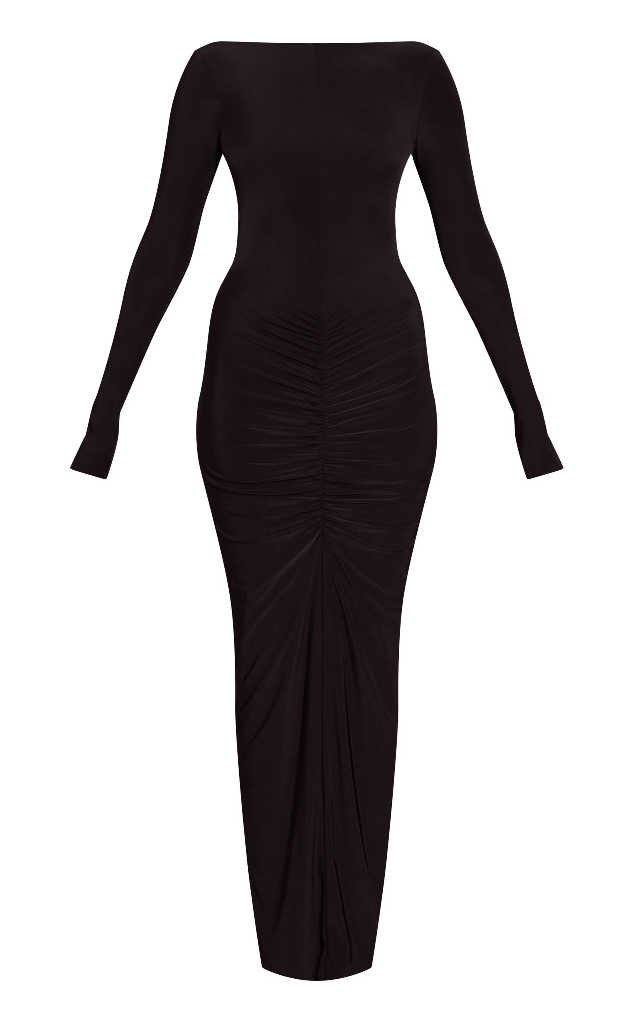 Unveil an undeniable presence for your next evening. The black slinky ruched low back maxi dress delivers a confident bodycon fit, defined by its striking deep V-back that makes a statement. Full-length sleeves balance the silhouette, while artful ruching down the rear expertly contours the form, creating a sleek maxi length. Complete this refined after-dark ensemble with elegant nude heels and subtle gold stud earrings, ensuring your look projects effortless, knowing style from every angle.