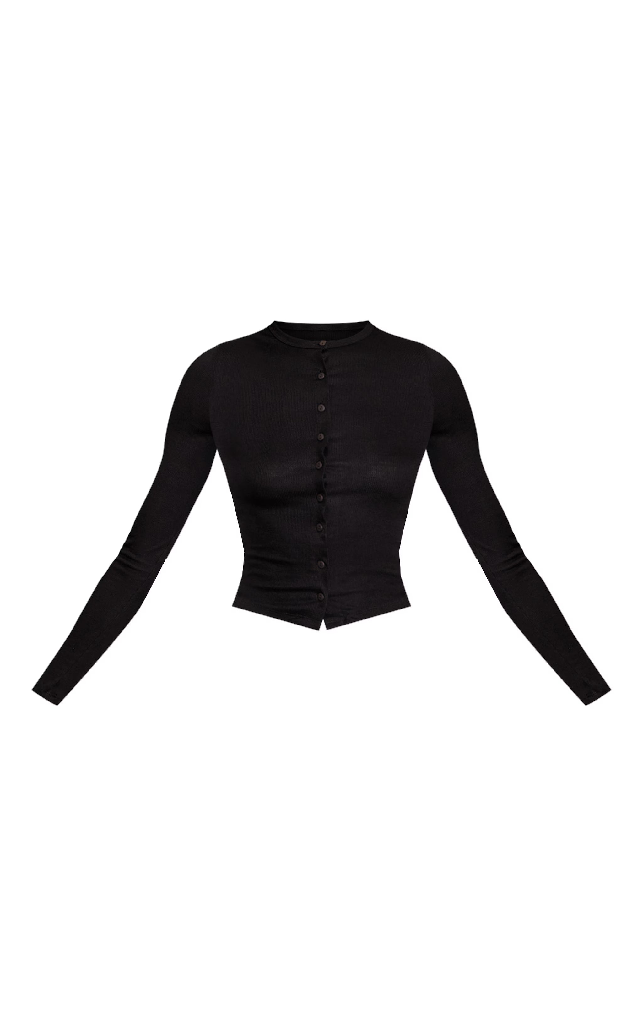 Keep it sleek with the black soft rib button down long sleeve top. Slim ribbed fabric and tailored button-down detail offer elevated basics. Pair with tailored pants and loafers for office-ready polish or tuck into a mini skirt with boots for evening contrast.