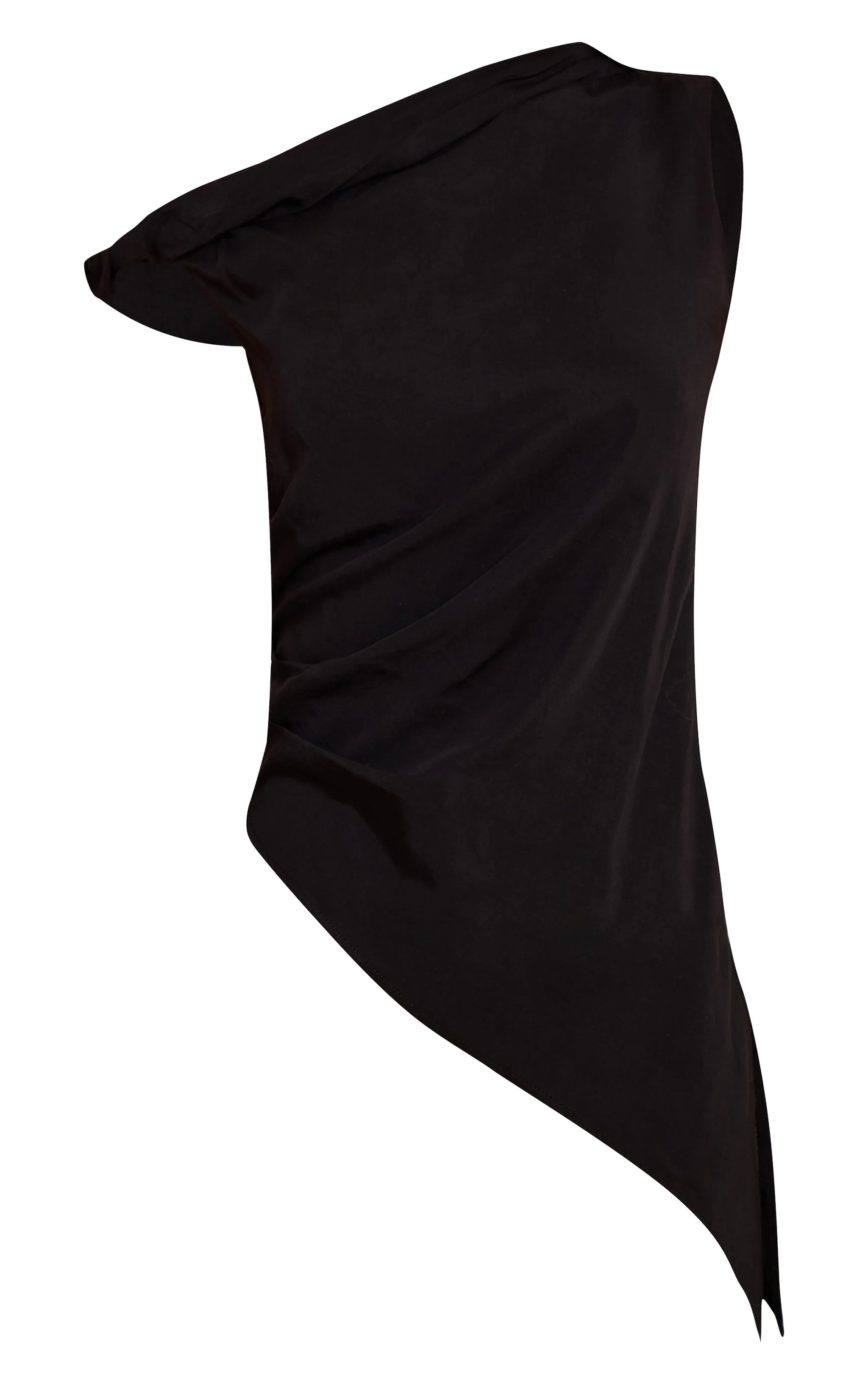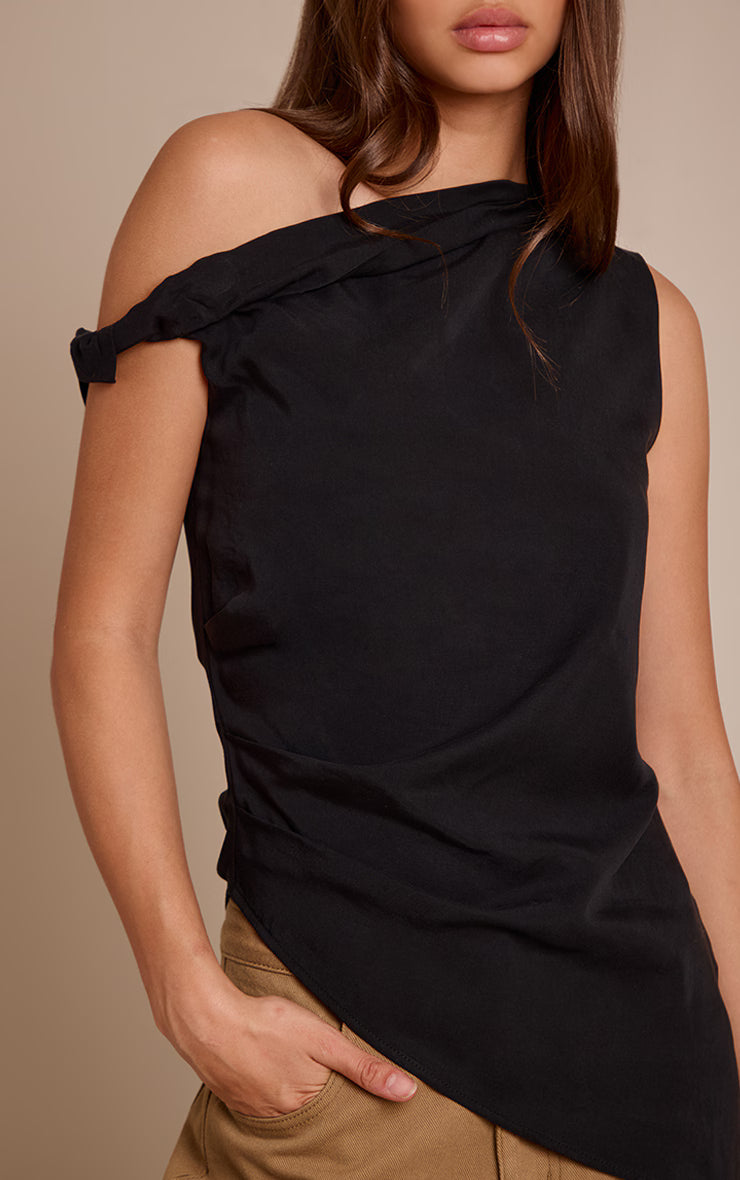 Turn heads in the black tencel asymmetric drape long top. Made from soft tencel fabric, this piece features an asymmetric silhouette with a fluid draped detail. Team with tailored pants and strappy heels for a refined evening look.