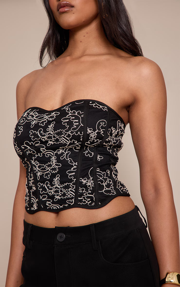 Command attention effortlessly. The black textured lace back corset offers a sophisticated foundation for evening looks, presenting a knowing blend of structure and artistry. Its flattering sweetheart neckline and strapless design are beautifully balanced by an intricate white textured embroidery that traces the bodice, creating a refined, sculptural outline. The clever lace-back detail ensures a custom fit, cinching the waist for an assertive finish. Pair this impactful piece with sleek tailored pants and statement gold heels, completing your ensemble with elegant drop earrings for an undeniable sense of occasion.