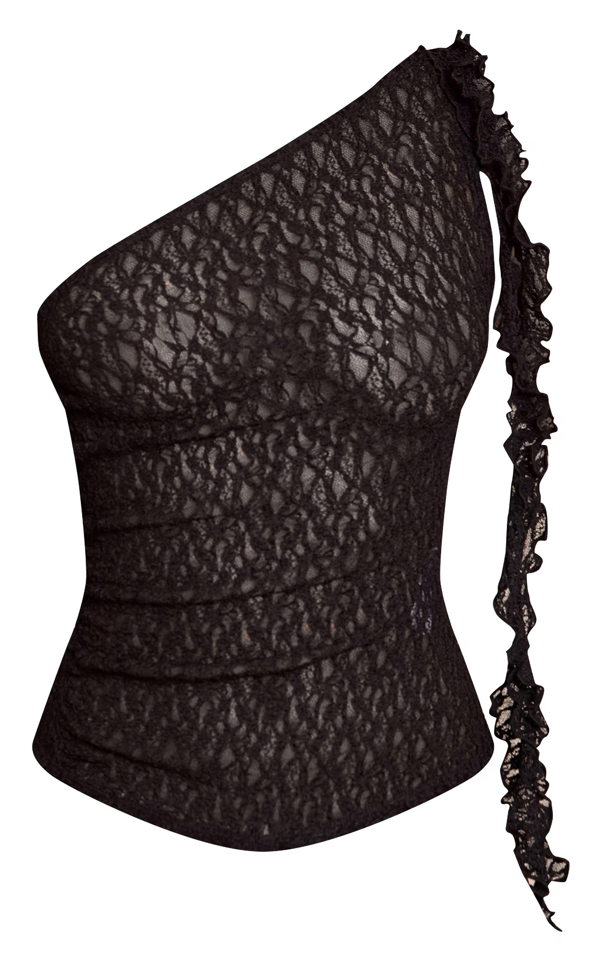 Some looks simply demand attention with their intentional design. The black textured lace frill drape detail asymmetric top embodies this, showcasing a distinctive one-shoulder neckline where intricate lace creates a striking visual. An artful frill drape detail cascades elegantly down one side, defining a refined silhouette. Perfectly suited for evening, style this statement cami with sleek tailored pants or a flowing satin midi skirt. Complete your ensemble with classic pointed heels and a confident stack of gold bracelets, curating an aesthetic that speaks volumes about your self-assured style.